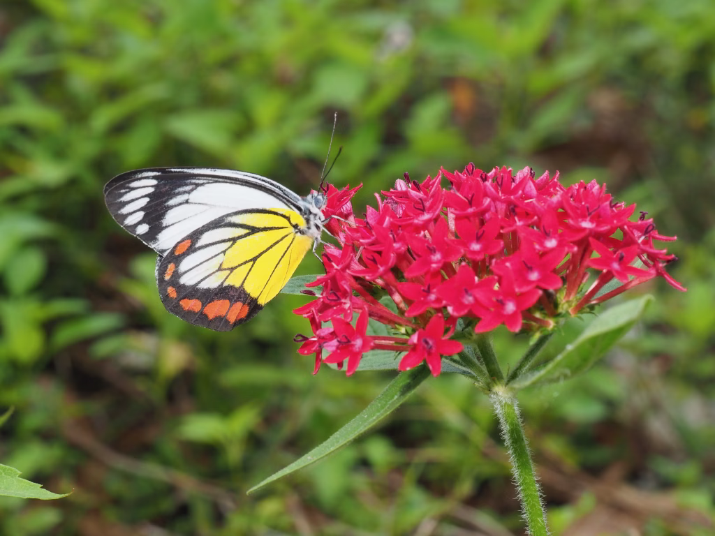 紅肩粉蝶和紅紋粉蝶是活躍於冬日的蝴蝶,牠們的幼蟲以⼤葉桑寄生的葉⼦為食,破蛹而出後,蛻變成美麗的成蝶。成蝶會在⼤葉