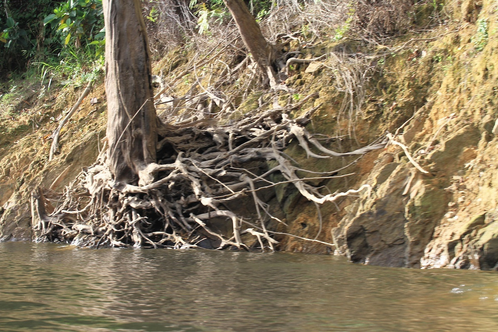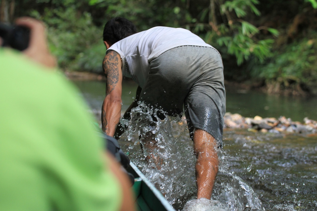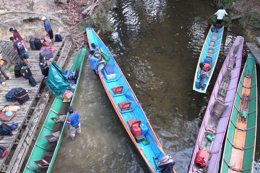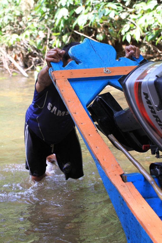 我們穿上救生衣和遮陽的帽子,行李被安置在長舟的前端,用遮雨布仔細覆蓋妥當,每艘長舟可戴3-4個人。長舟的最前方有一位駕駛負責察看水流方向,調整長舟行進的角度,判斷灘地的深淺, 他有時要用木槳划水,有時要撐篙過彎,還得打信號給舟尾掌管引擎的舵手。 當然,如果遇到水淺的灘地,或者枯木擋住河道,乘客都得下舟涉水步行,或幫忙推舟,大家團結合作,才能使長舟在蜿蜒的河道上順利前進。我們就這樣上下停頓,或走或航,經過許多不同的礫石灘地,顏色或黑或綠或清澈的水流,在兩鐘頭又20分鐘的奮戰後,終於平安到達部落長屋的碼頭。