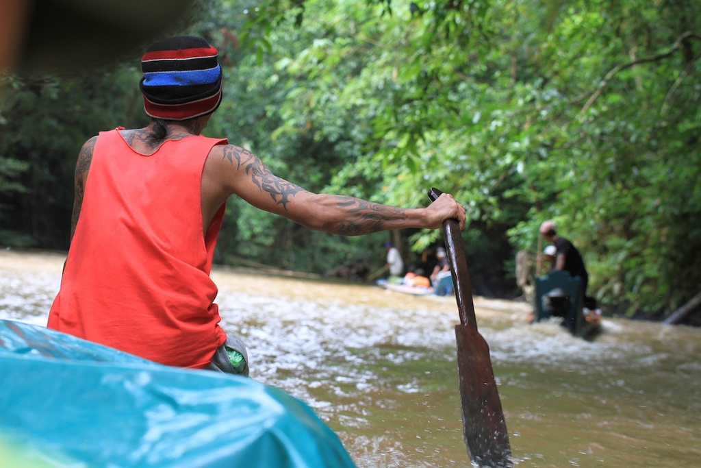 你看,眼前這群船夫已經開始忙碌起來, 他們是這塊土地的主人-伊班族人,現在仍居住在木頭建造的高腳長屋中, 平日以燒墾農耕過生活,也善於打獵和捕魚, 更是水上功夫一級棒的駕舟高手。隨著文明的進步,他們改良了傳統的拼板船,在長舟的末端裝上引擎馬達,這樣一來既可節省體力,也能增進行舟的效率,於是接送來訪部落的觀光客便成為他們重要的業 。