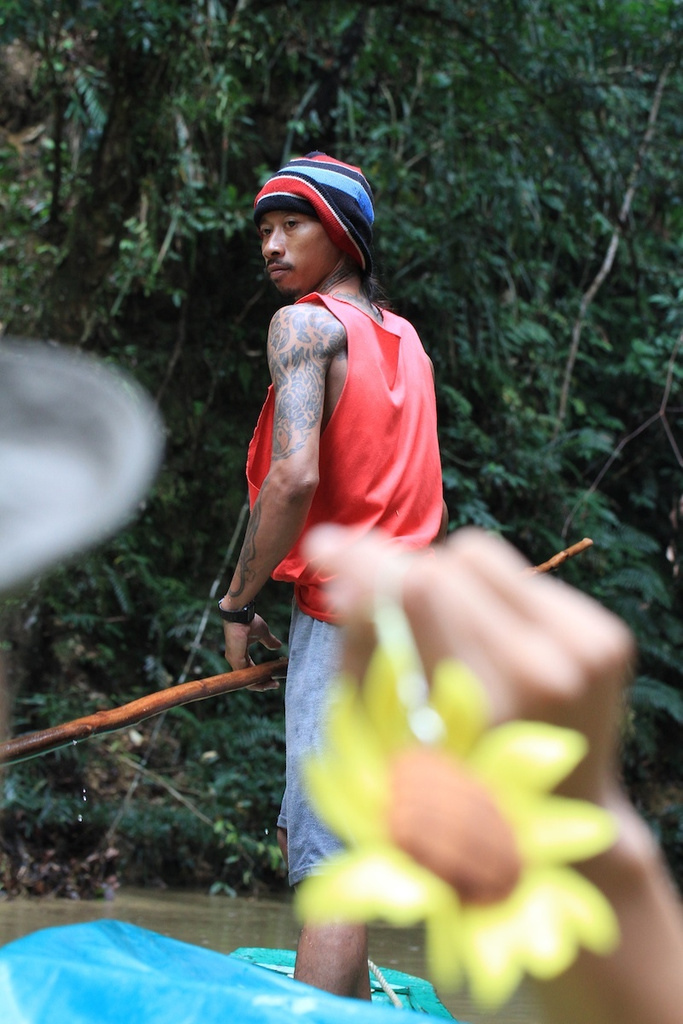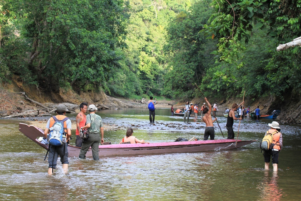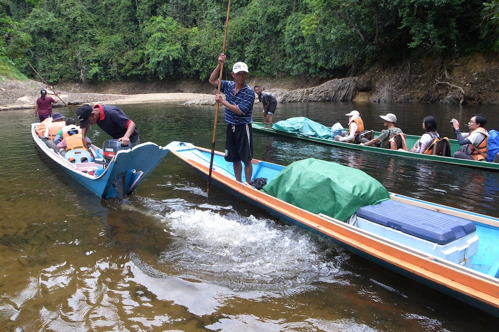 我們穿上救生衣和遮陽的帽子,行李被安置在長舟的前端,用遮雨布仔細覆蓋妥當,每艘長舟可戴3-4個人。長舟的最前方有一位駕駛負責察看水流方向,調整長舟行進的角度,判斷灘地的深淺, 他有時要用木槳划水,有時要撐篙過彎,還得打信號給舟尾掌管引擎的舵手。 當然,如果遇到水淺的灘地,或者枯木擋住河道,乘客都得下舟涉水步行,或幫忙推舟,大家團結合作,才能使長舟在蜿蜒的河道上順利前進。我們就這樣上下停頓,或走或航,經過許多不同的礫石灘地,顏色或黑或綠或清澈的水流,在兩鐘頭又20分鐘的奮戰後,終於平安到達部落長屋的碼頭。
