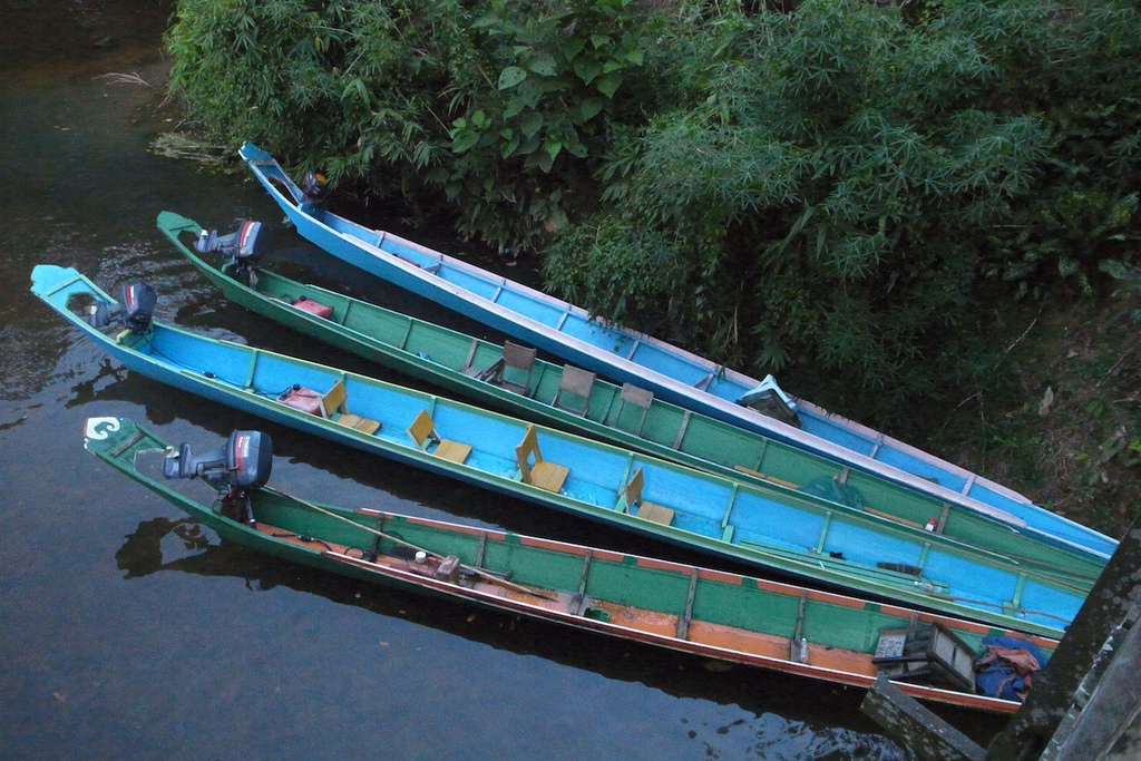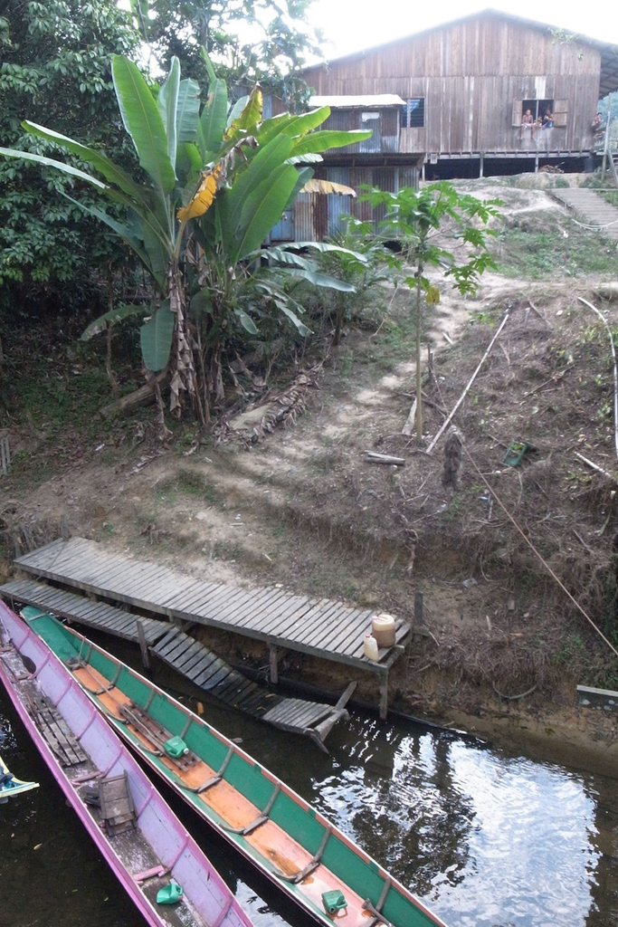 得恩,此刻小花歪斜地繫在我的背包上,我提起行李再步上部落的階梯時早已氣喘噓噓,一隻活蹦亂跳的公雞闖入我的視線,牠在高腳屋下趾高氣昂地巡視領地,忽上忽下的飛跳,木屋裡有一位伊班族的婦人抱著小孩倚在窗口,我和她交換了陌生而靦腆的微笑,並順著她的窗口往外看,那些失去動力的長舟就停泊在午後的河邊,彷彿嬰兒安睡在母親懷抱,那安靜。