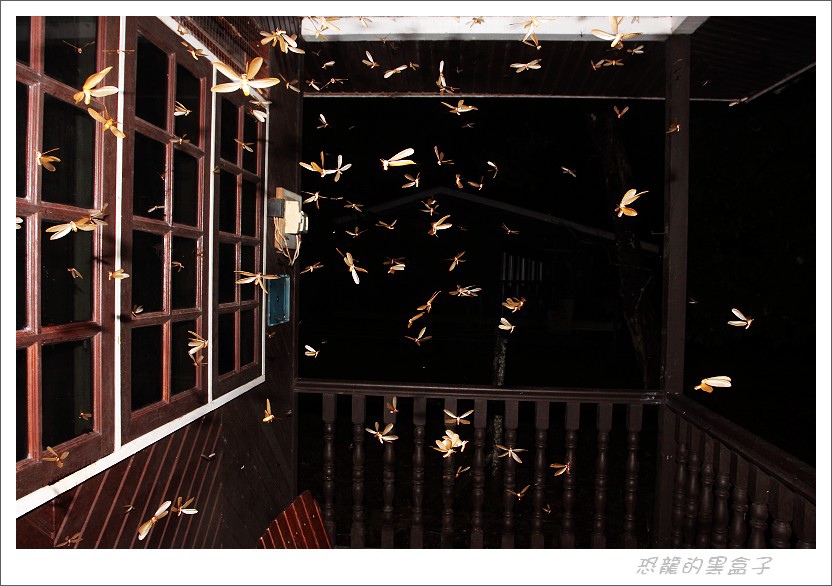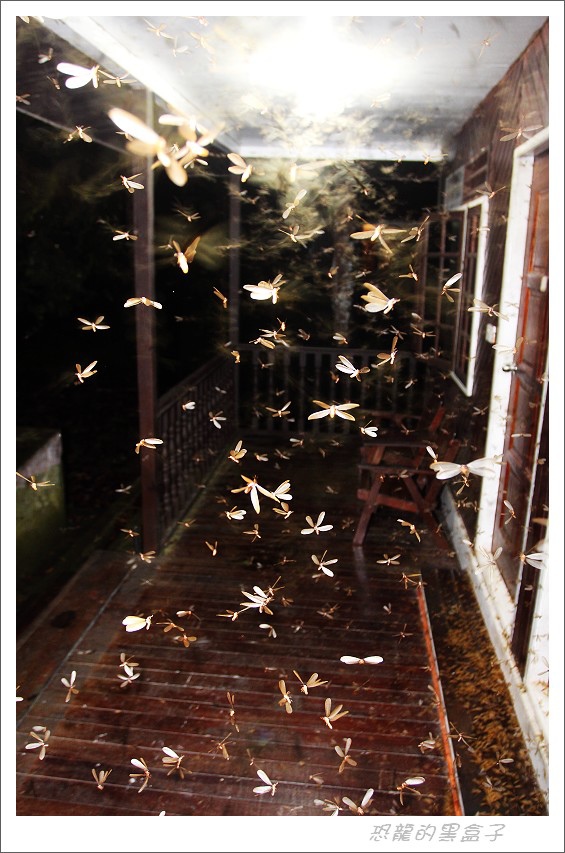 我看著門縫裡還有白蟻不斷爬進來,趕緊關了屋裡的燈開門一探究竟,沒想到屋外更是可怕,走廊上開著的兩盞白色燈光吸引了上千隻的飛蟻,像個白色龍捲風繞著燈光打轉。見此奇景反正睡不著了,反身回屋內拿了相機出來。
