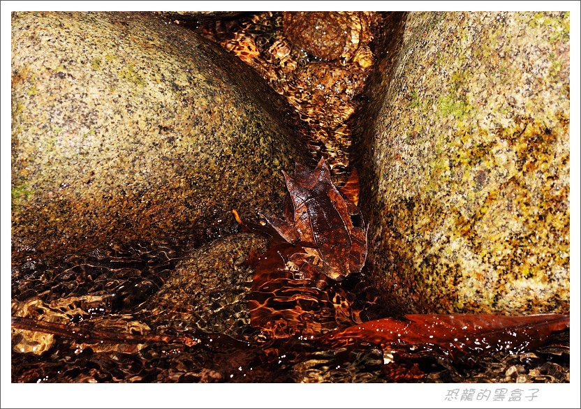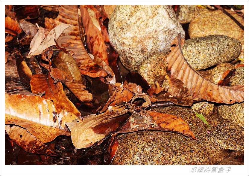 流水潺潺,角蛙趴在溪石落葉堆中,展現高明的擬態功力。