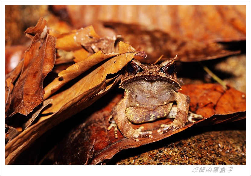 眼窩上方的角狀突起就是牠偽裝的秘密武器,這是加汀國家公園的角蛙 Malayan horned frog〈Megophrys nasuta〉。晚上聽音辨位比較能夠找到牠,到了白天牠隨便往石縫落葉堆中一躲,要想見牠就不太容易囉。