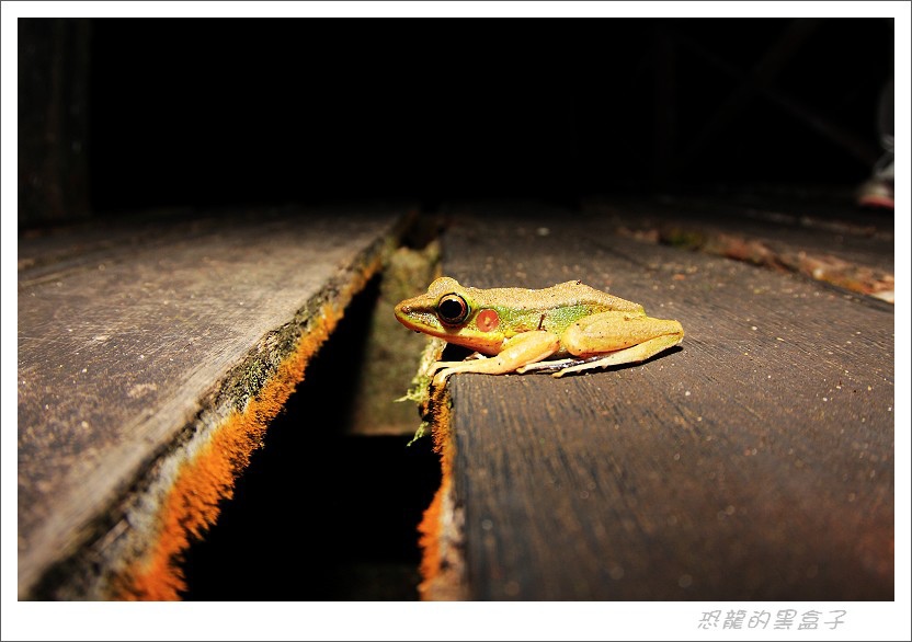 首先看到一隻中型的綠色樹蛙趴在木棧道上,接著水邊又看到一隻,雖然腳上有吸盤,不過看牠的習性倒有點像斯文豪赤蛙。