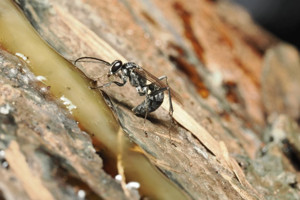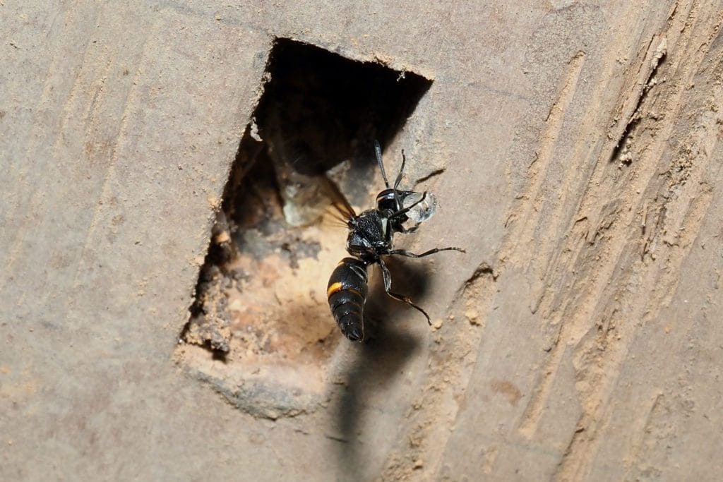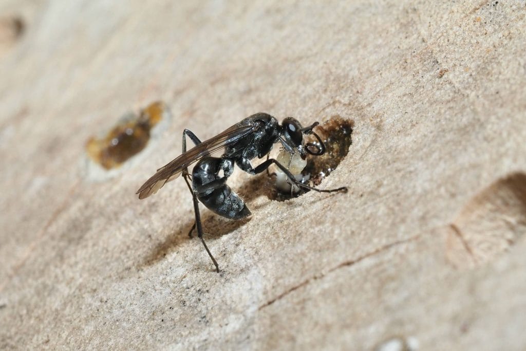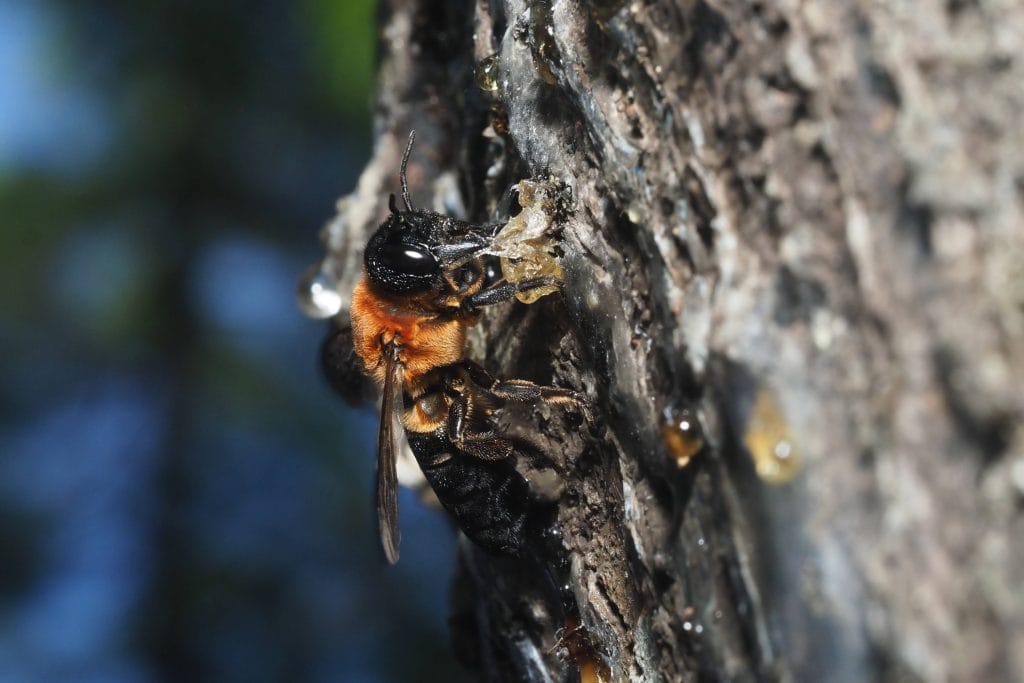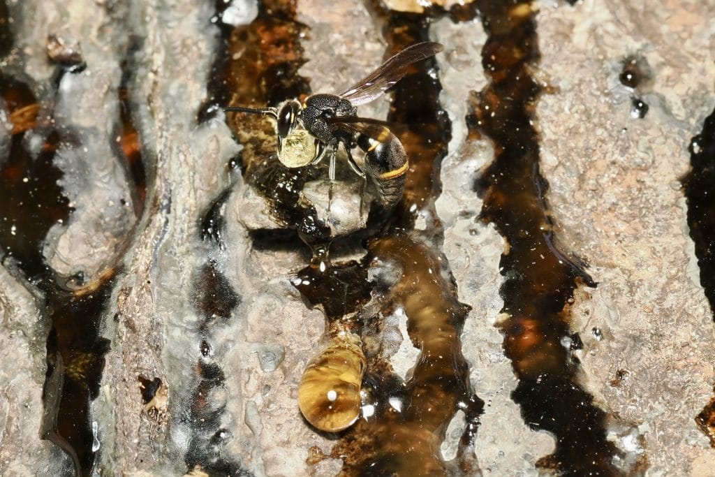 將近一個多月的觀察,有3種蜂前來採脂。分別是胡蜂科的黃紋短腰蜾蠃,蛛蜂科的奧溝蛛蜂屬,和切葉蜂科的粗切葉蜂。