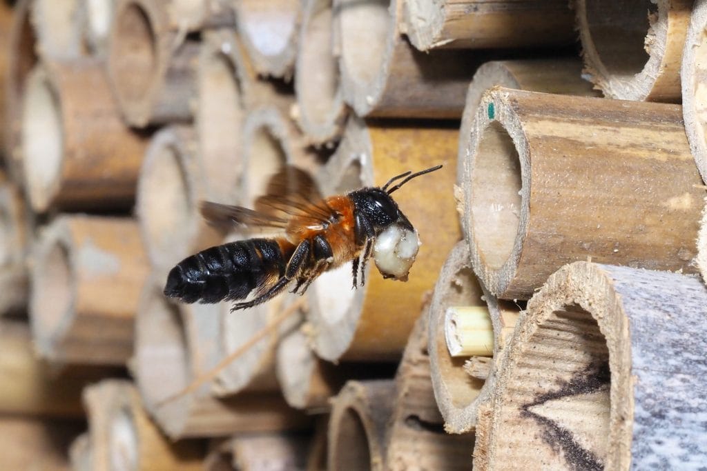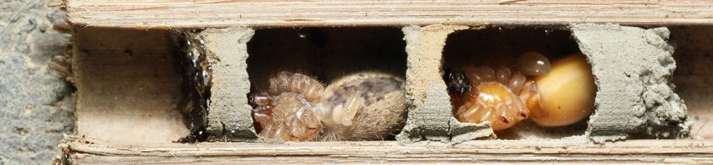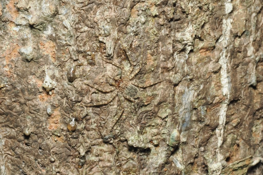 在等待獨居蜂前來的時候,我們也會觀察樹幹上的變化,看見螞蟻被樹脂黏住,是琥珀形成的初期。還有一些隱藏在樹幹上的蜘蛛,有著絕佳的保護色,為漫長的等待時間增添許多樂趣!