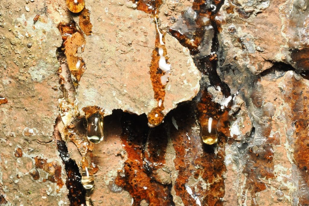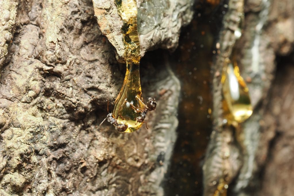 一般來說,植物分泌樹脂是對傷口的一種保護,樹脂有殺菌的作用,因此有些獨居蜂尤其是切葉蜂科會利用樹脂作為築巢的材料。這株黃連木有部份枝幹已經乾枯,滲流樹脂的面積不小。