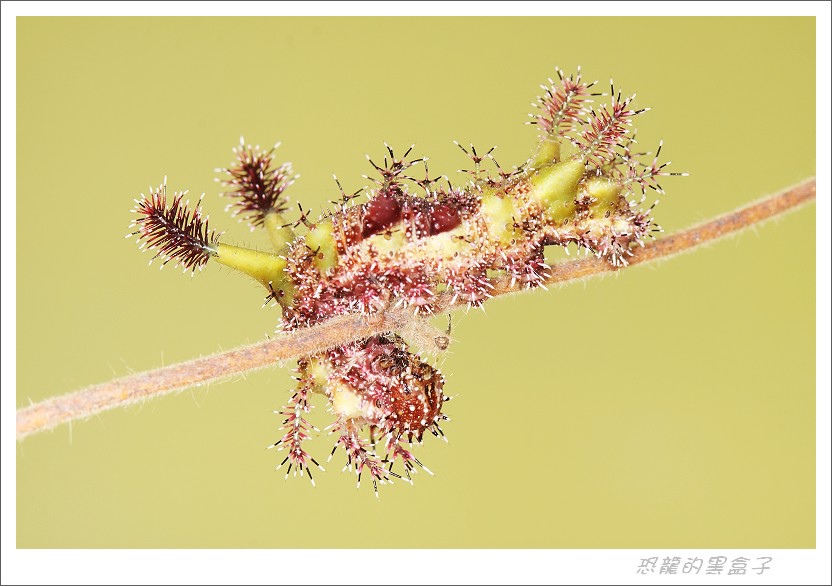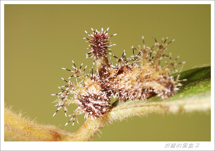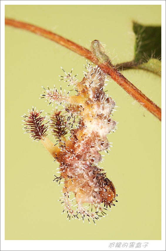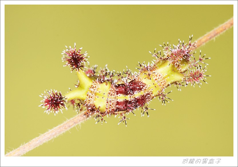 直到蛻化成終齡紫單帶蛺蝶幼蟲又是一番不同的場面,開始走華麗的路線,顏色由暗黃逐漸轉為紫紅,胸部的兩根麻花辮和身上如珊瑚礁般的肉棘更加的放肆起來,這簡直已經超出一隻蝴蝶幼蟲應有的裝飾程度,可以媲美設計師精心製作的藝品了。