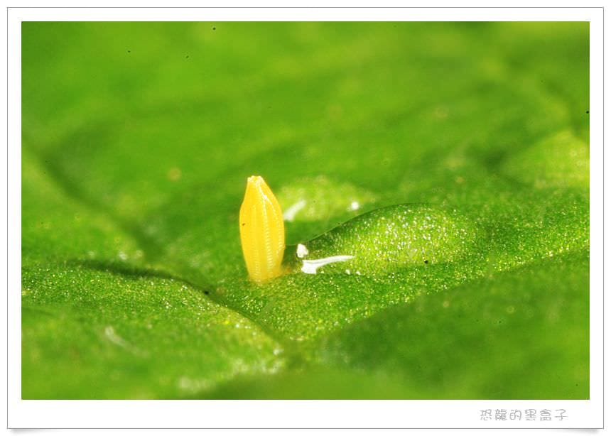 砲彈型的蝶卵散生於葉下表面,數量多時連葉上表面也有,不久由米色轉黃,代表即將孵化。