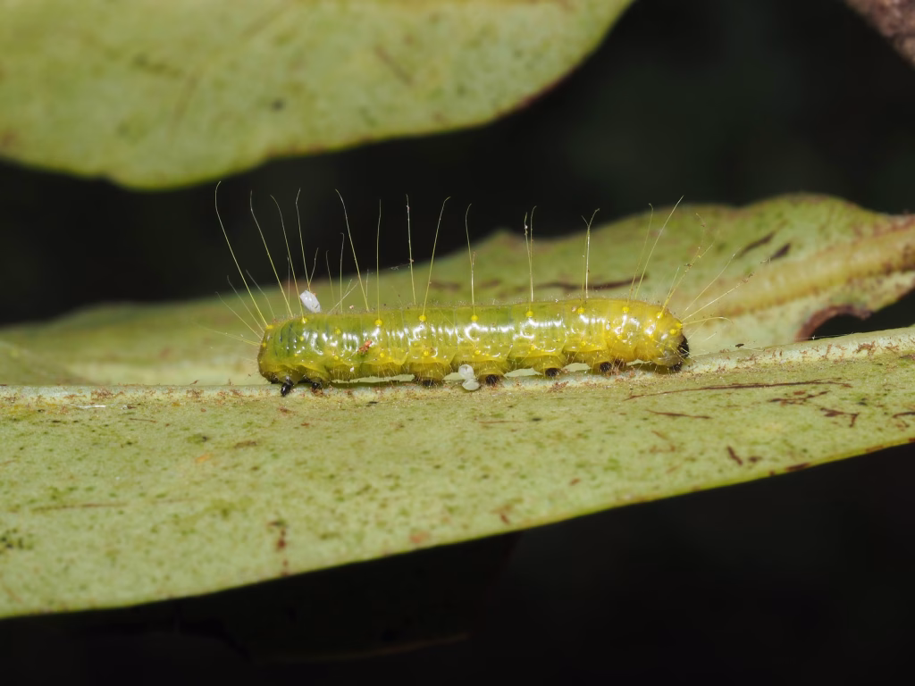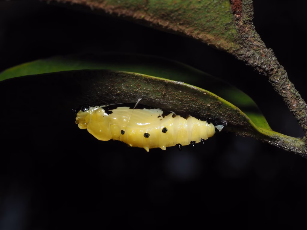 兩種粉蝶都選擇將卵產在大葉桑寄生的葉面上,不過顏色和排列方式可以明顯區分。