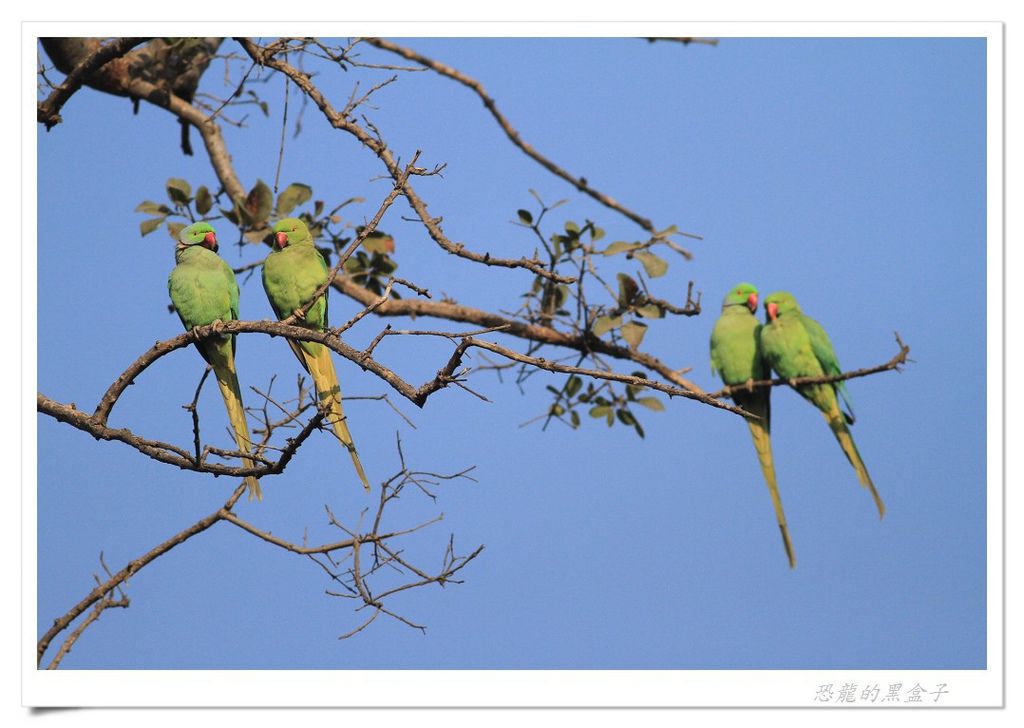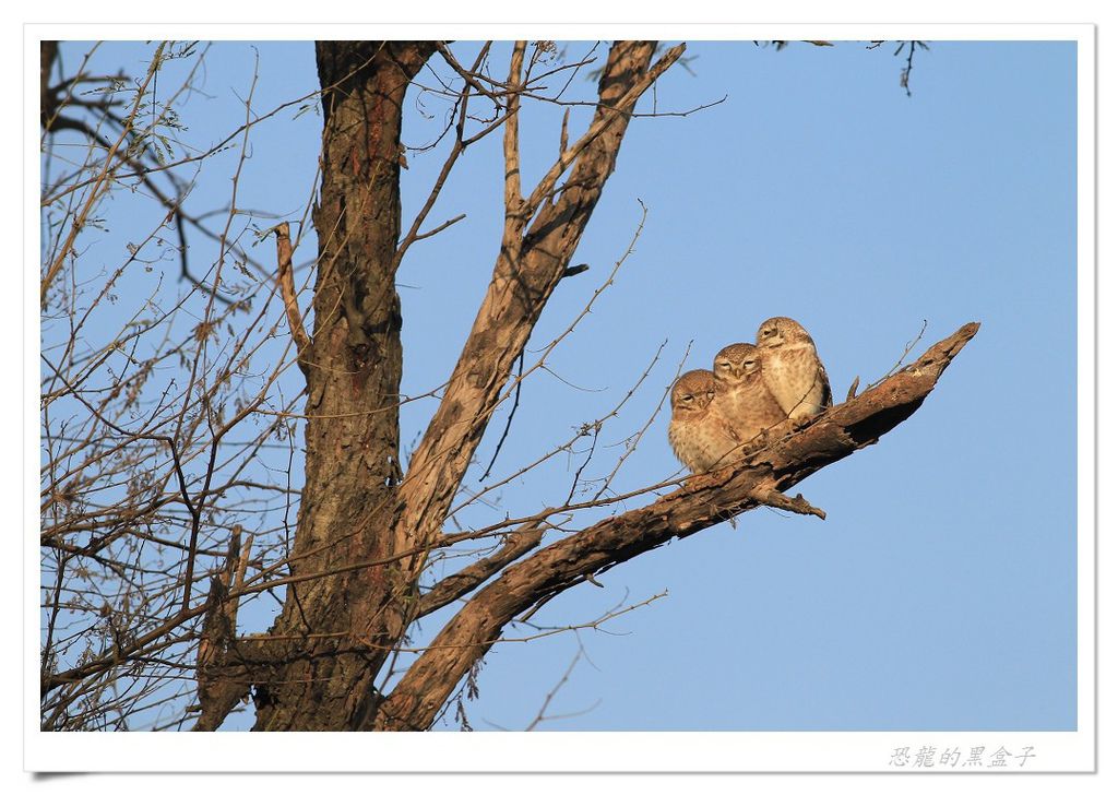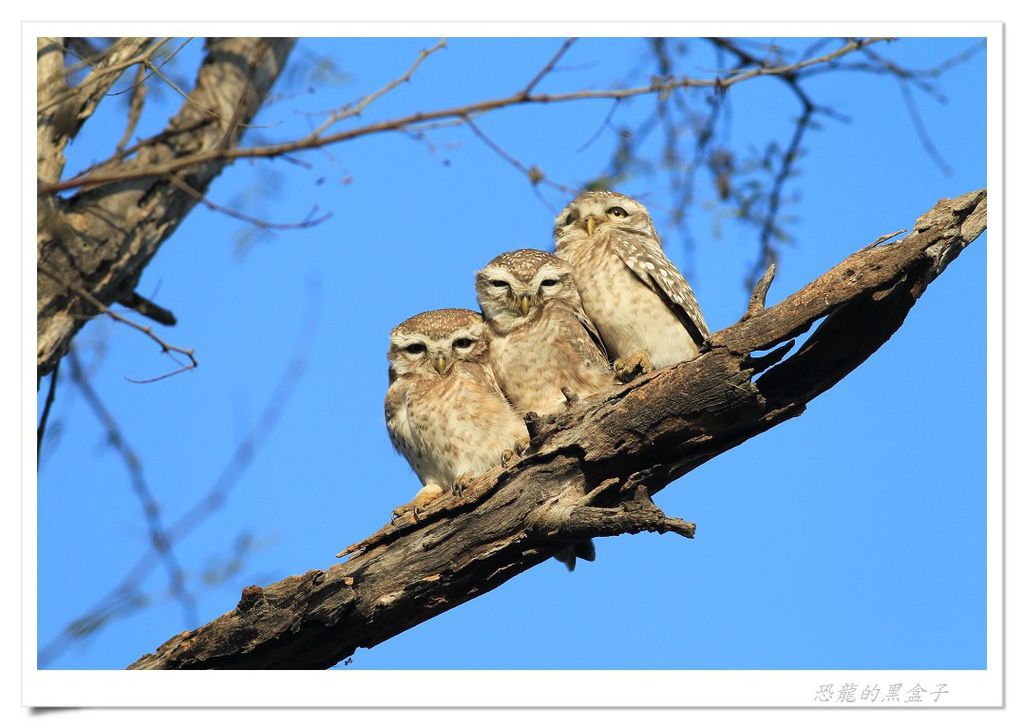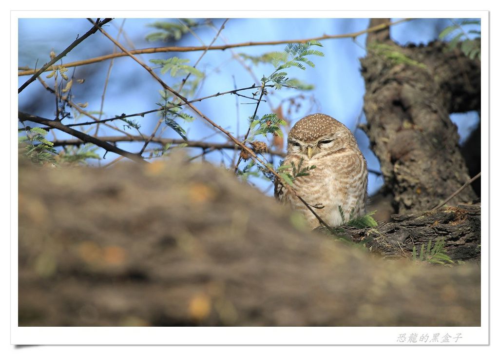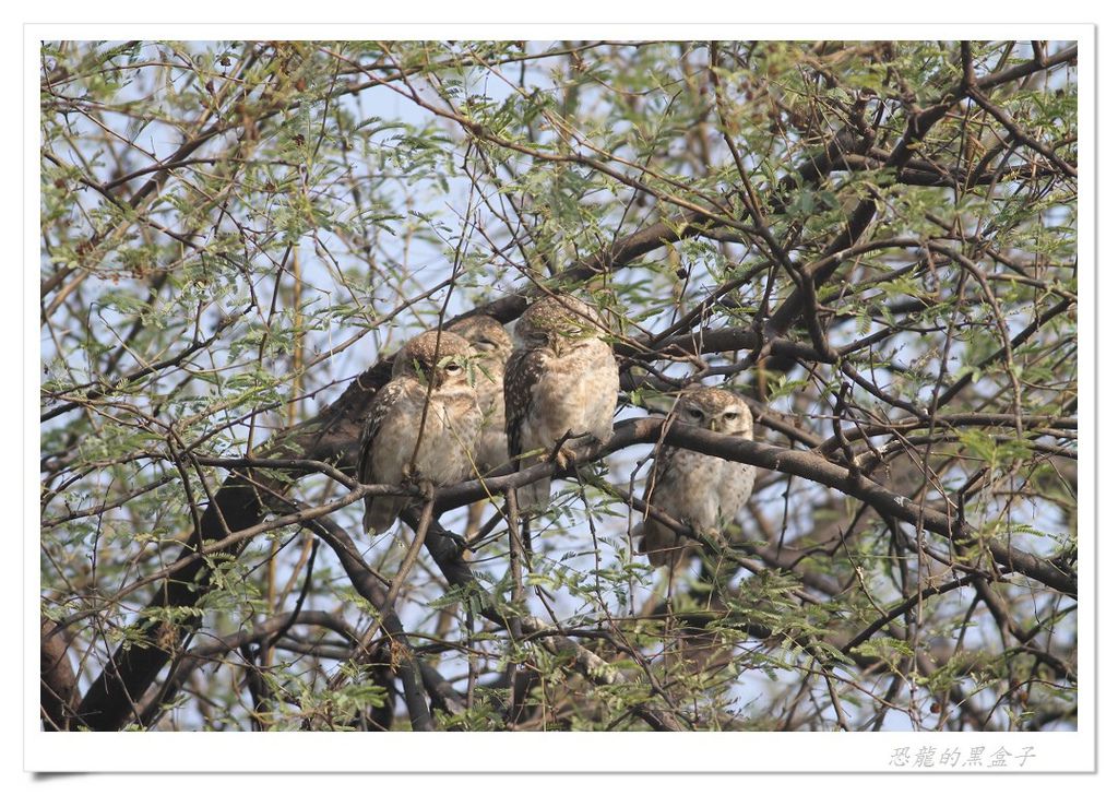 不過他很快發現我們跟丟了,不知從何處鑽了出來把我們帶回正軌, 因為正值印度的旱季,所有的樹都無精打采葉落殆盡,早晨的光線像一把火似乎瞬間即可點燃,不久我們接近一棵大樹,樹幹上橫出一截枯枝,他躡手躡腳的前進,我們也躡手躡腳跟隨,待到近處肉眼可見樹梢上一字排開,三隻可愛的橫斑腹小鴞正瞇著眼打著盹呢。看見有人接近,勉強睜開一隻眼瞧瞧我們要幹啥?又忍不住清晨暖暖的陽光催人入眠,看著我們樂不可支,手上的相機舉著也不知按了多少張同樣構圖的快門。