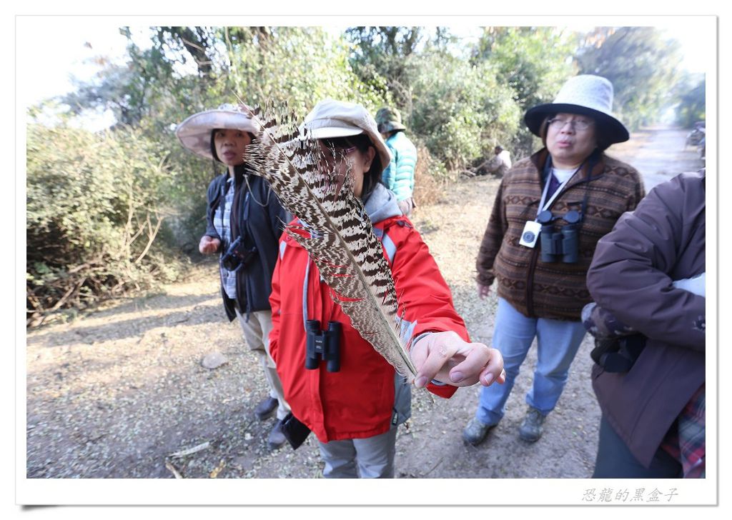 對於鷹族的狂熱也感染了我們,大家也開始認真辨識鷹種,一支掉落地上的美麗羽毛,上面的花紋似乎暗示了鷹類的可能,結果鳥導巴圖一看給了一個跌破眼鏡的答案:『孔雀母鳥』,身價立刻一落千丈,空歡喜一場,哈哈。