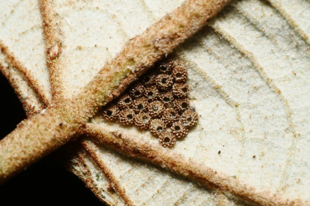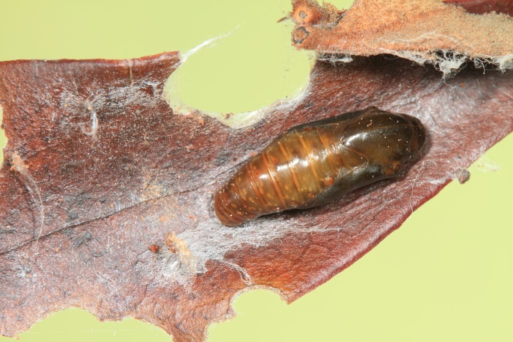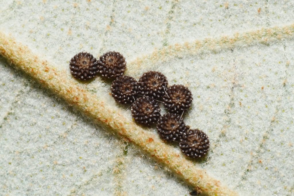 另外一次則是在桃園虎頭山,麋鹿夥伴在白匏子葉片上發現了幼蟲的蹤跡,這次還發現了卵,可以完整地記錄幼生期。根據「蝴蝶生活史」圖鑑一書的記載,幼蟲的食草包含:細葉饅頭果、菲律賓饅頭果、白匏子、山黃麻、山豬肉、大頭茶、青剛櫟、大青、爬森藤和咖啡,一點也不挑食,雖說如此要在野外觀察到幼蟲也並不容易。