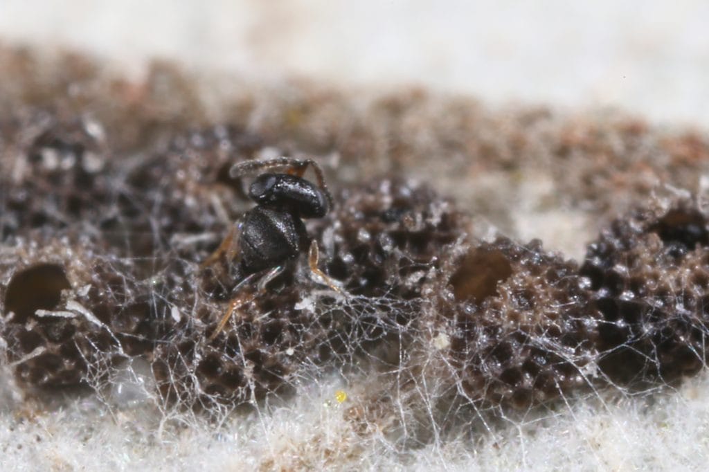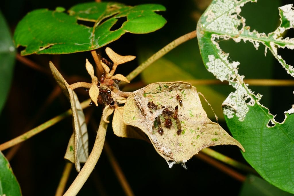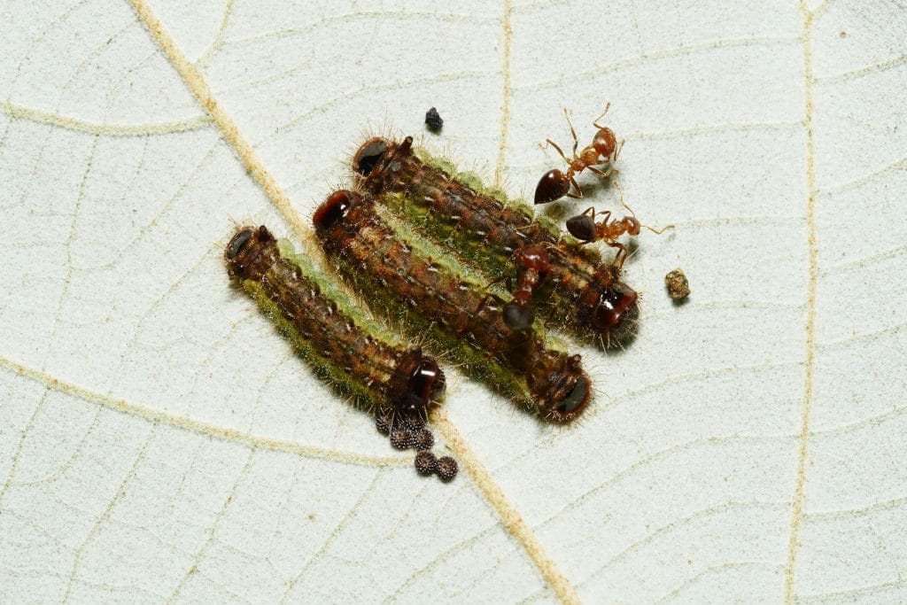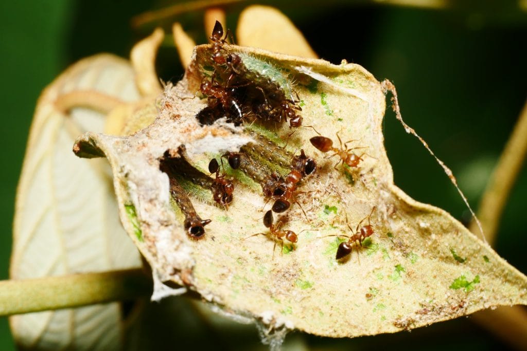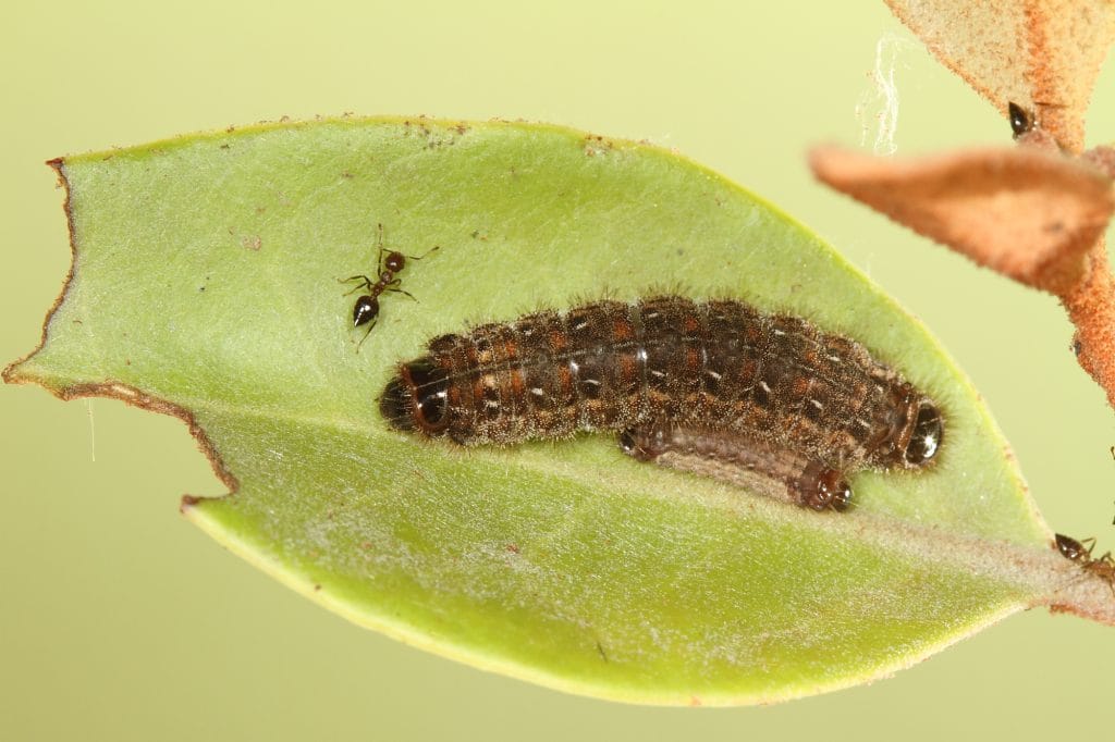 除了美麗親民的成蝶,幼蟲的生態也令人著迷,因為食性廣範許多科的植物都有攝食,但是要尋得幼生期得請螞蟻帶路。第一次接觸是蝴蝶老師帶領我們在三峽山區的一所學校尋寶,桂花樹上的大葉桑寄生有個舉尾蟻巢,大葉桑寄生厚實的葉片被啃的缺角斑駁,雖然表面上看不出所以然,但是專家帶路已經了然於胸。在他的指示下,我們翻開葉片包覆的蟲巢,果然看到了精彩的幼蟲,螞蟻進進出出好似母親安撫寶寶一般,有科學論文證實,有舉尾蟻照料時可以提升幼蟲的存活率。