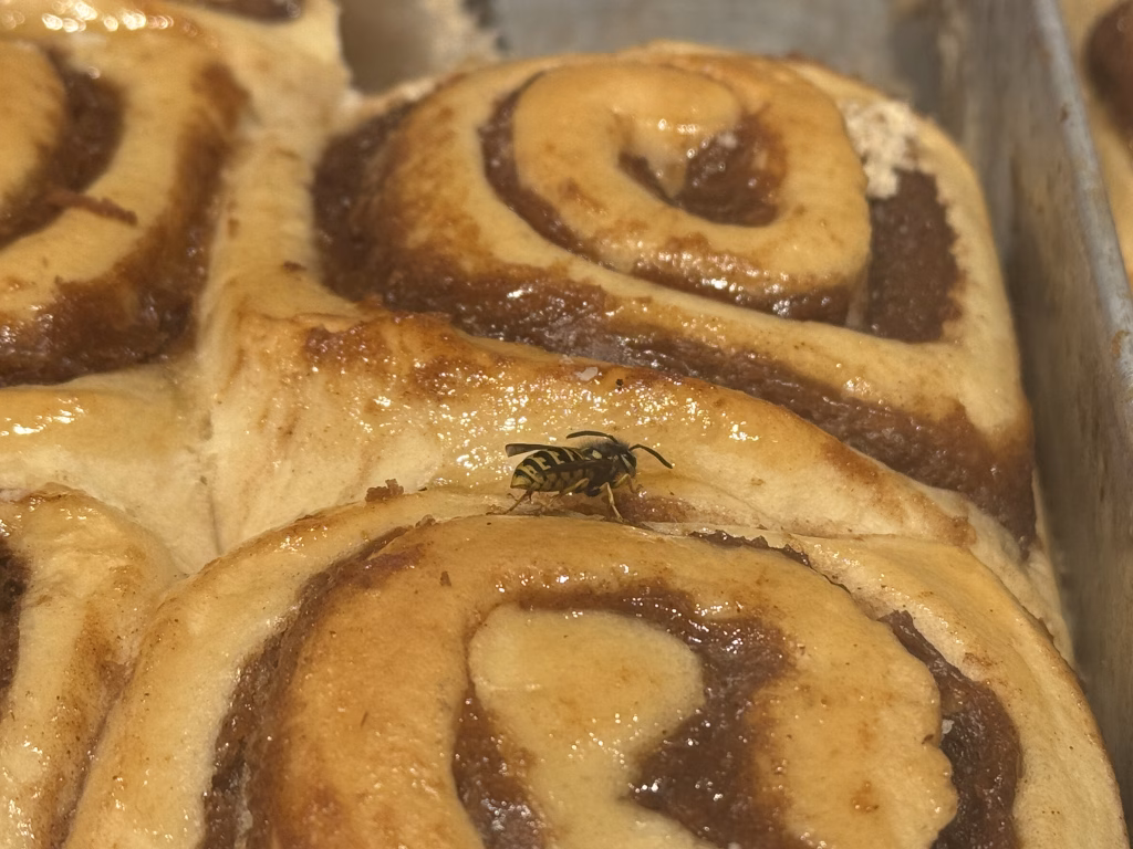 小浩火速鑽進一家香味四溢的甜點店,我也連忙擠進去開開眼。好不容易撥開人群,站定在玻璃櫃前,我定睛ㄧ瞧,咦!肉桂蝸牛捲上居然有兩三隻胡蜂捷足先登,正展開地毯式的「試吃」活動。我瞟了一下四周的人們,只見大家氣定神閒,談笑自如,絲毫不以為意。我只好勉強吞下一肚子的驚怪,趁小浩結帳的空檔,連忙抽出手機「自然觀察」一下。