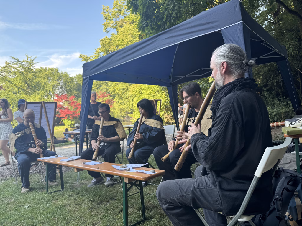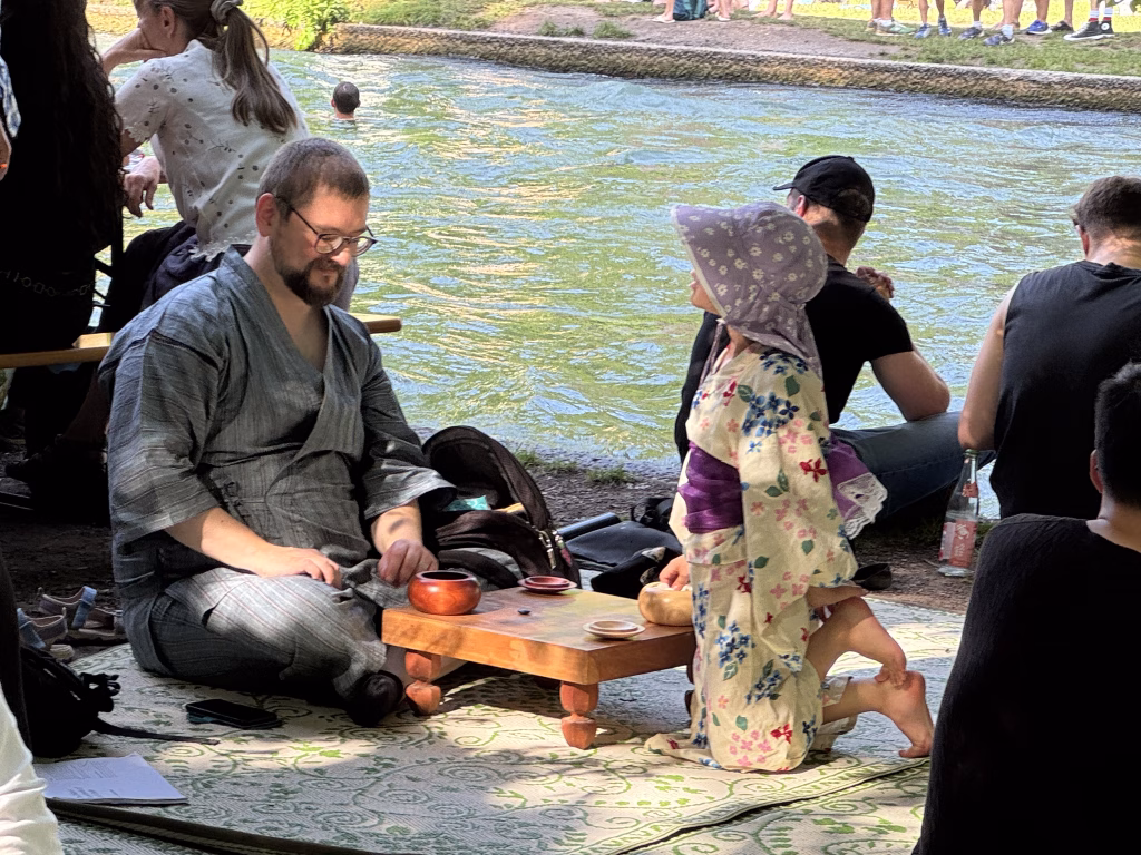 從街頭轉入公園,則是另一個異次元的空間。狂人們在湍急的河道上衝浪,不時引起喧鬧歡騰的水花,看熱鬧的人們則在河岸樹蔭下席地而坐。明惠把腳伸進冰涼的河水裡,我們因瞬間襲來的冰鎮激靈,相視而笑。年青人以Cosplayer的裝扮亮相,動漫人物一一華麗登場,遊走在公園的各個角落...有人射箭、有人下棋、有人演奏尺八簫。而真正令我們大感驚訝的是,樹下的垃圾桶溢流出一堆酒瓶,其中居然有隻「聞香下馬」而誤入歧途的胡蜂,牠在酒瓶中忽上忽下的振翅,直盯著著玻璃瓶外的花花世界,苦苦掙扎。
