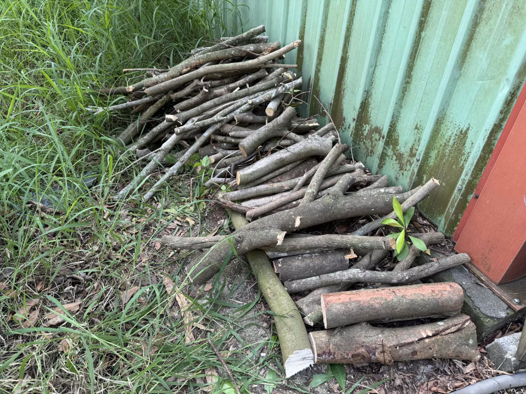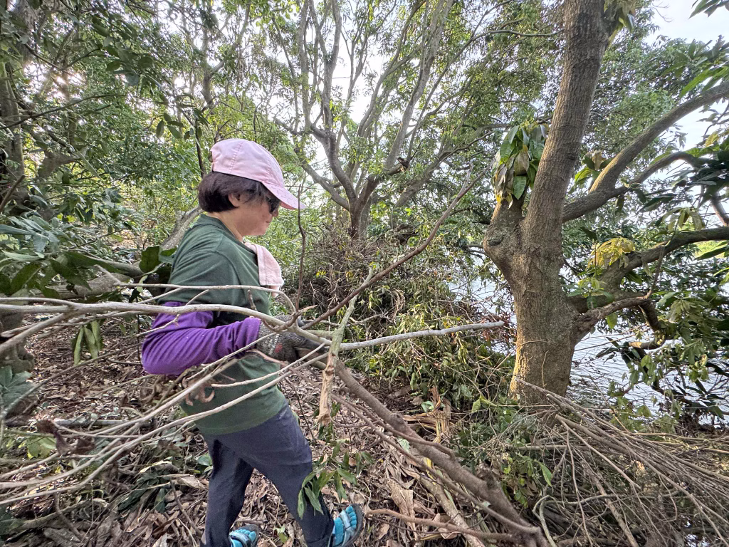 下午4點過後,我們便全副武裝登埸,選定老廚房週邊大樹的細枝拖移,為主要工作目標。阿姨用手鋸分解粗樹幹,麗明將細枝條拖移到湖岸邊,我再把被支解過的粗木段堆疊在屋角。工作默契十足的「神力女超人」們在2小時後,便把原本堆滿凌亂枝椏的園子,清理出鬱鬱蔥蔥的清麗模樣。