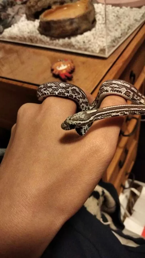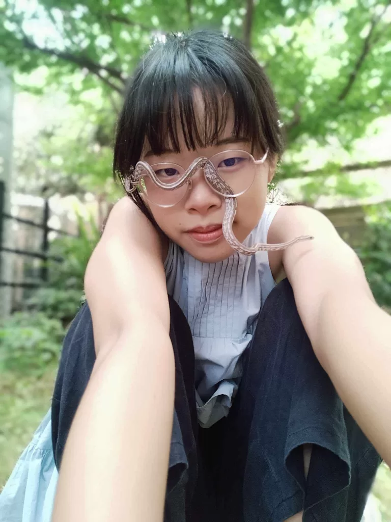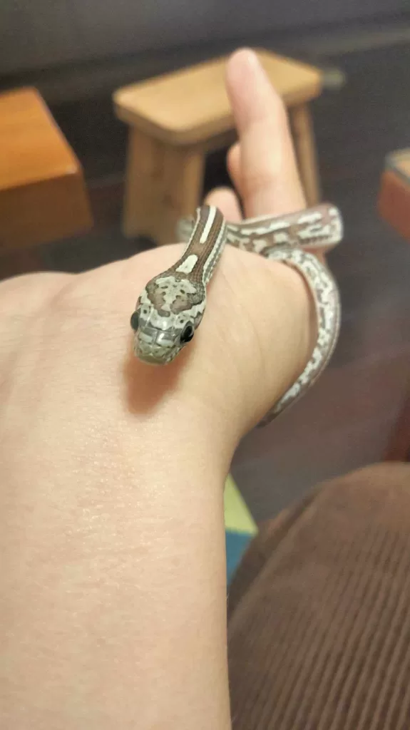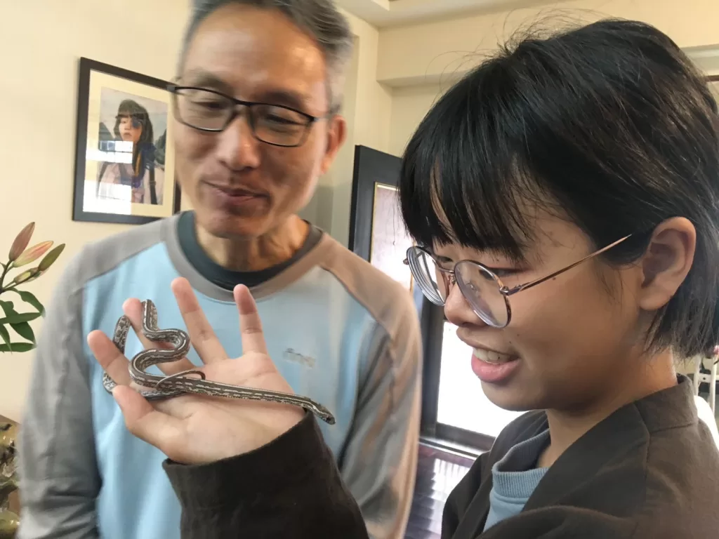 恬:「因為本來就覺得蛇很可愛 ,再加上去年2023暑假去新竹昆蟲館當志工,跟參加獸醫營因此有機會接觸很多蛇 ,也慢慢了解牠們 ,就越來越喜歡,之後就養了。牠是一隻玉米蛇名字叫桑椹,我養半年了。」