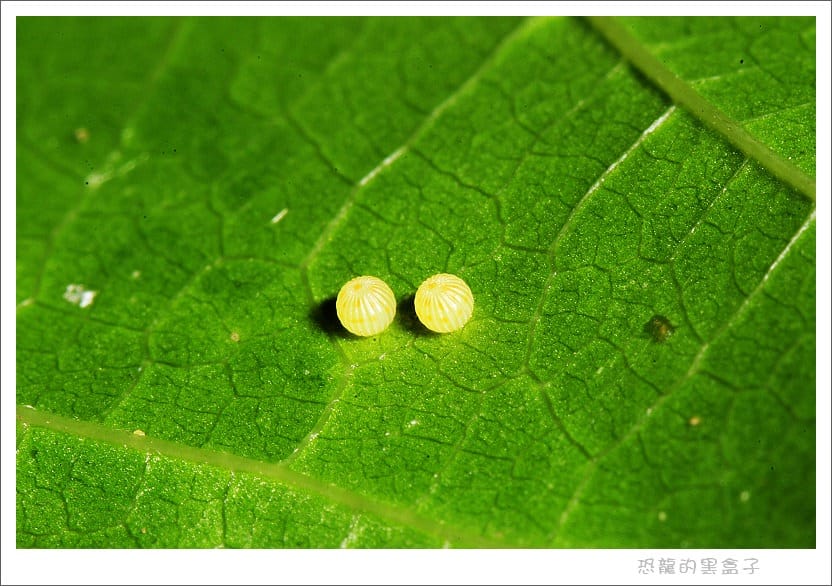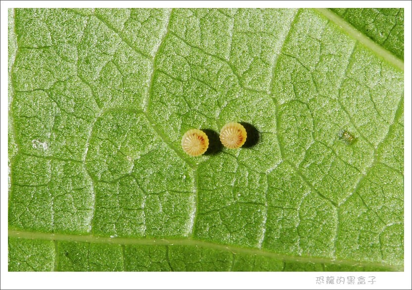 圓圓的卵有點像小時候吃的柑仔糖,上面已經有些橘色的斑點,這是呈現受精斑的豹紋蝶卵。