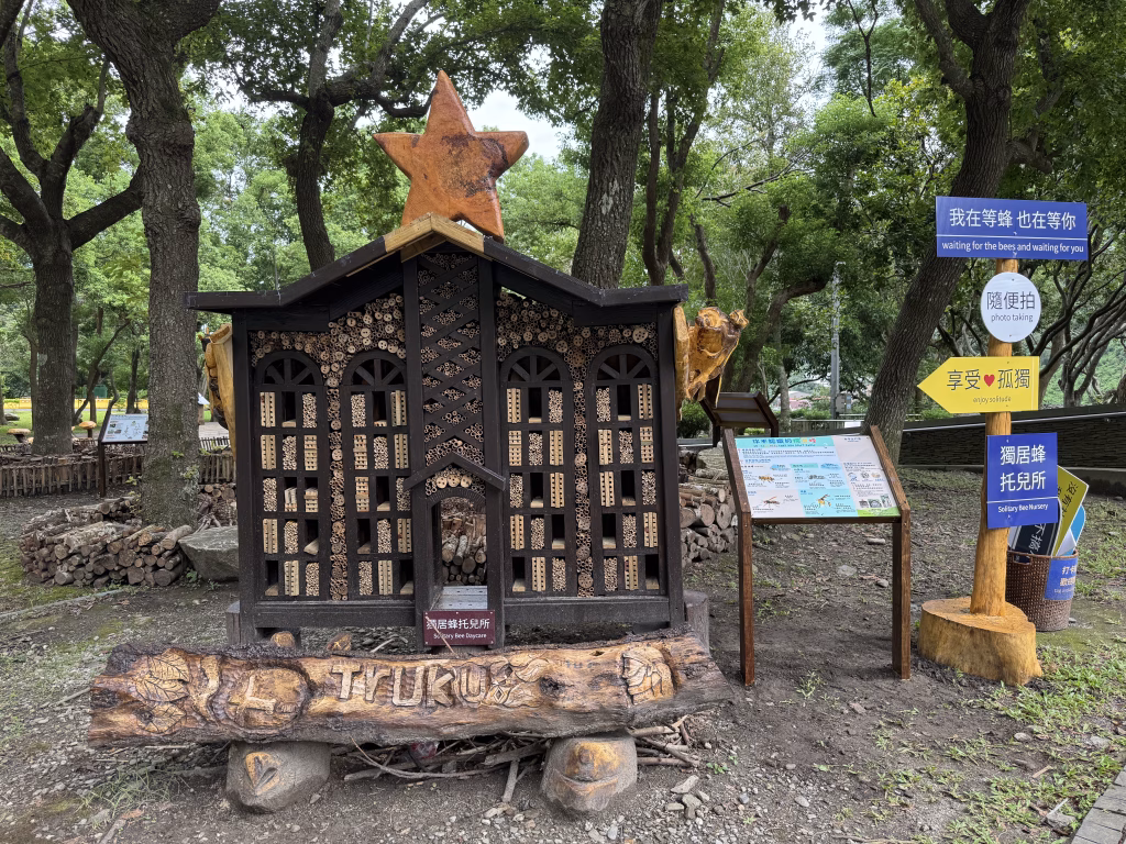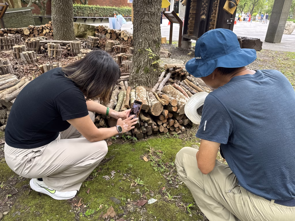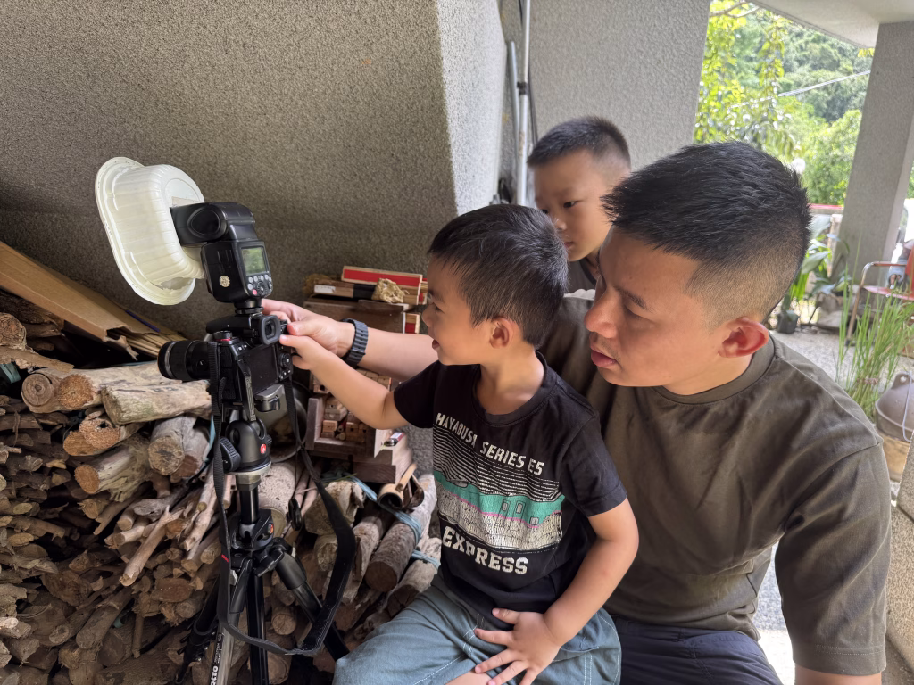 2025-0810 尖牙一家回鄉下,兩位小寶貝除了在小池塘撈魚,便是好奇地擠在柴堆的小椅子上瞎攪和,一邊裝模作樣的學按快門,一邊好奇緊盯螢幕裡蜂媽媽採花粉、啣葉渣、叼樹脂。
