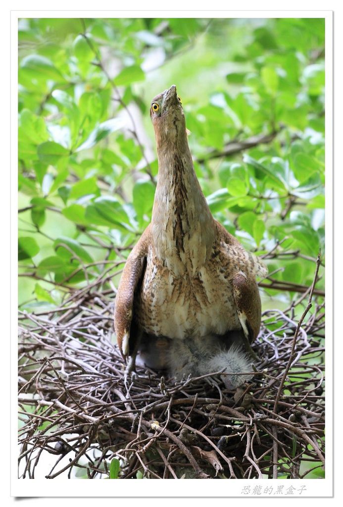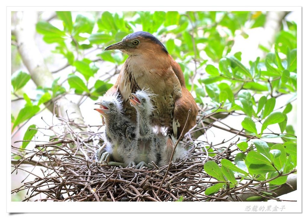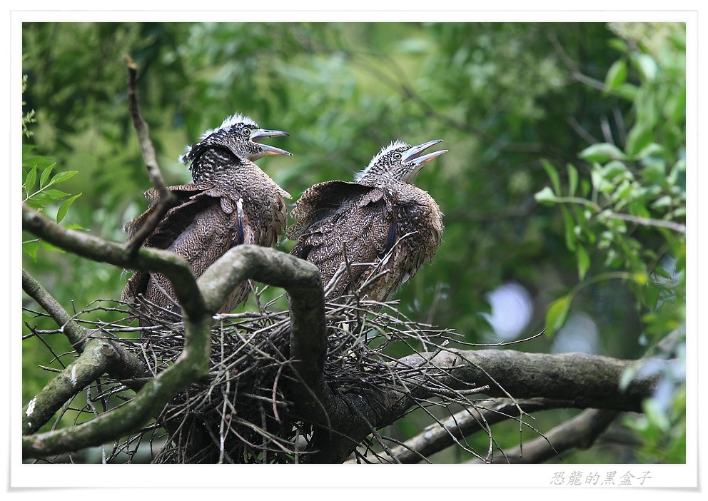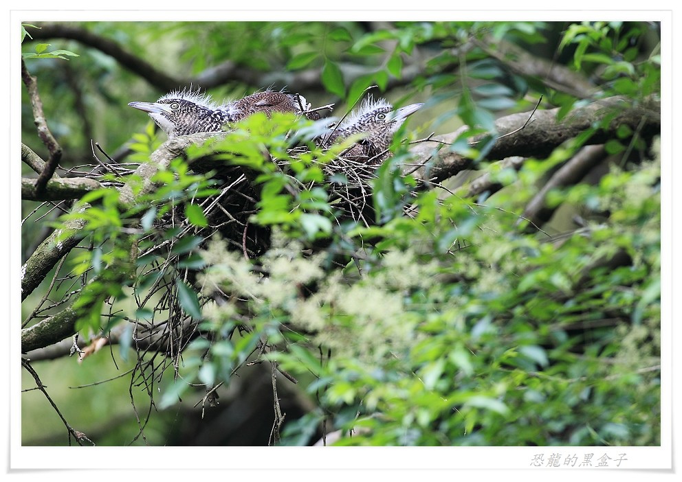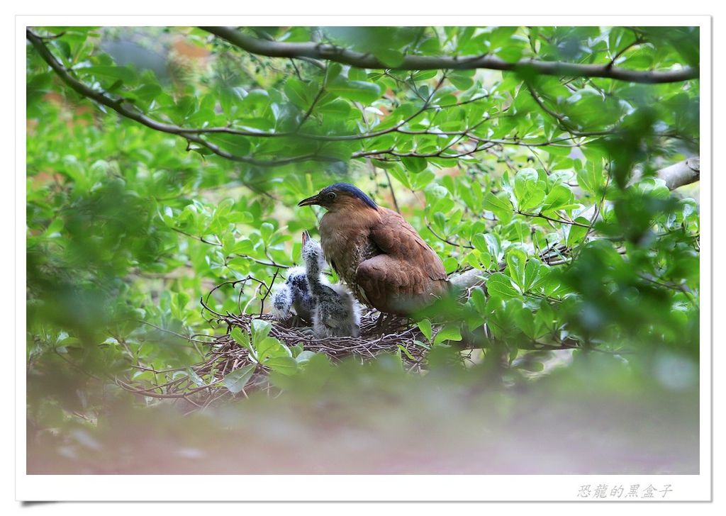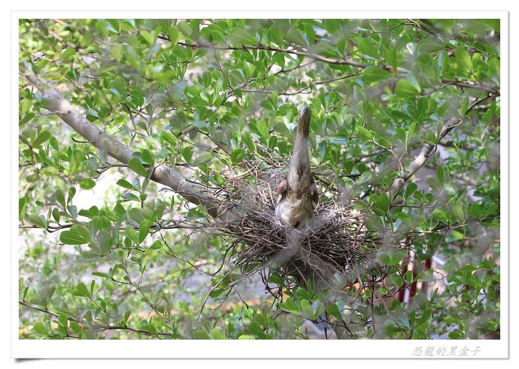 後來在高峰植物園的小小溼地上方,也曾觀察過牠們育雛末期兩隻亞成鳥的有趣模樣,雖然體型已經長得跟親鳥差不多大小,仍然賴在快要塞暴的巢中等待親鳥前來餵食,但是親鳥也不願妥協,就站在不遠的樹枝上冷眼旁觀,希望孩子能自己離巢獨立,一場耐心與毅力的比賽在初夏的蟬鳴聲中默默地行著。