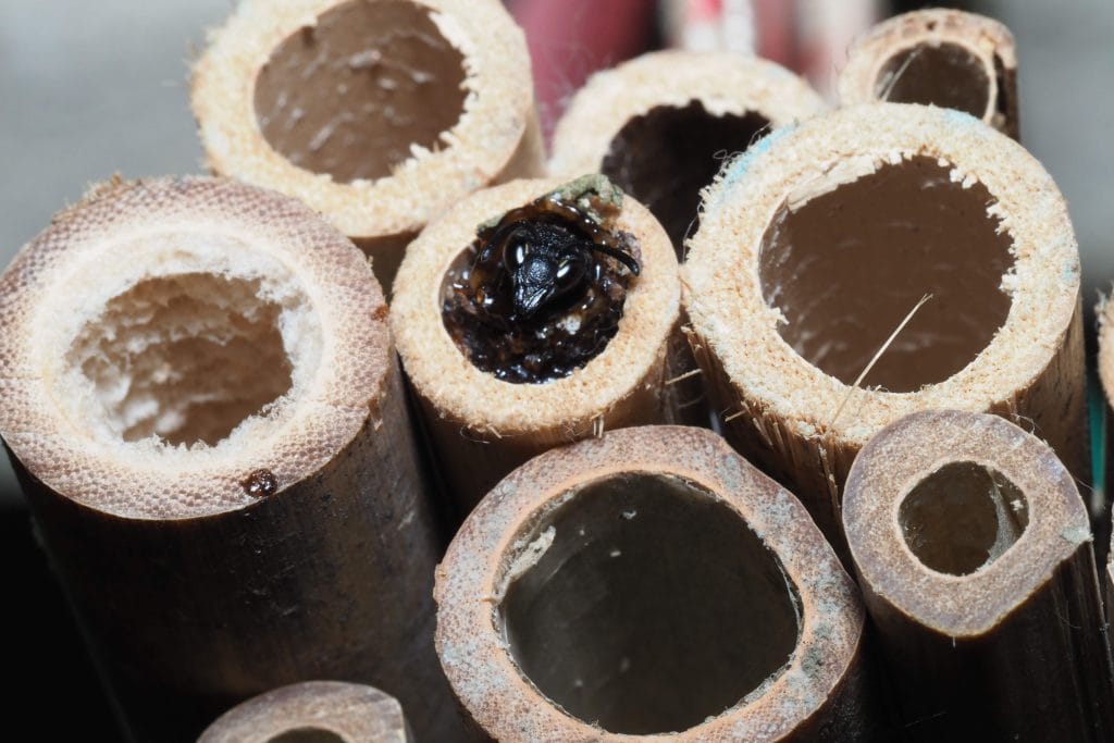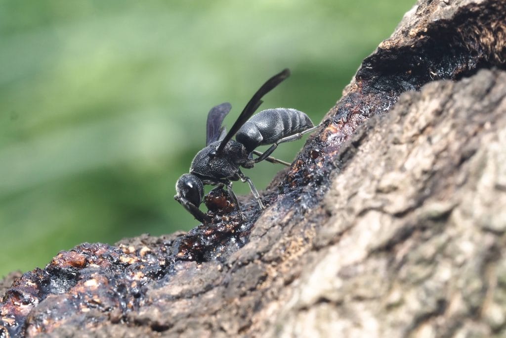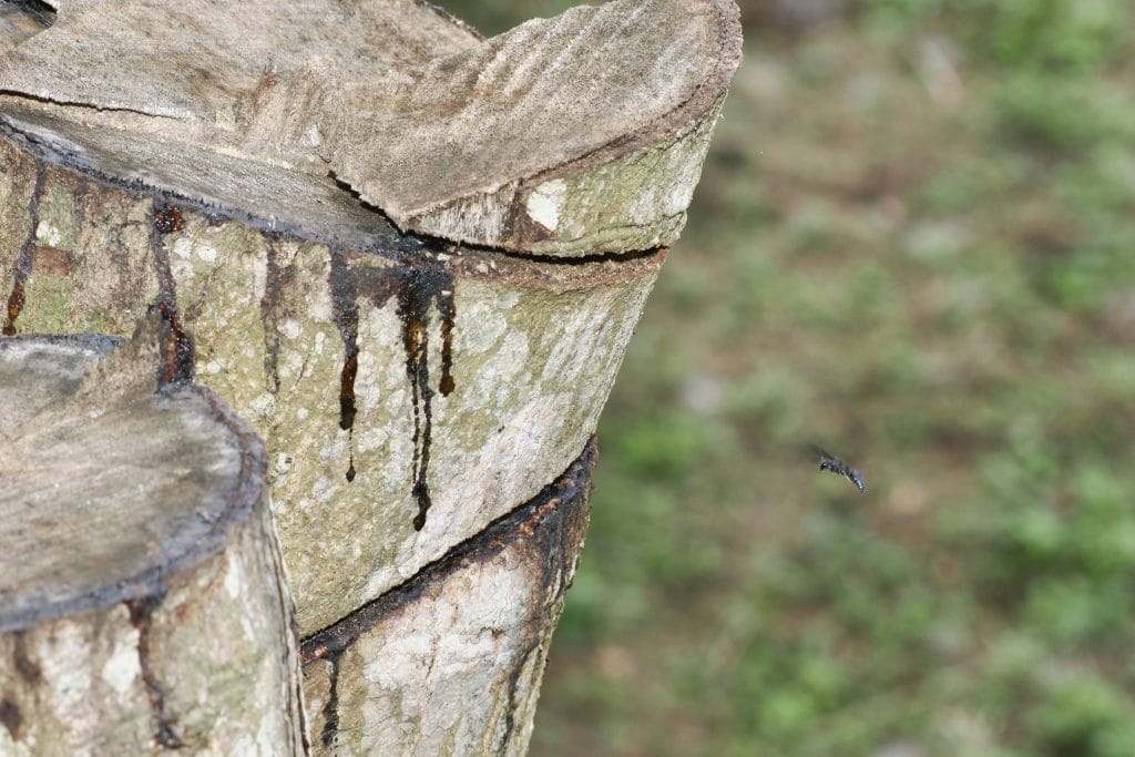 樹脂的來源應該非常多元,附近的森林裡有許多選擇。多年之後我們才有實際觀察採脂的機會,是路旁一棵被鋸斷的芒果樹,傷口流出的樹脂逐漸變黑凝固,成為中華異喙蜾蠃和其他切葉蜂的採脂場。