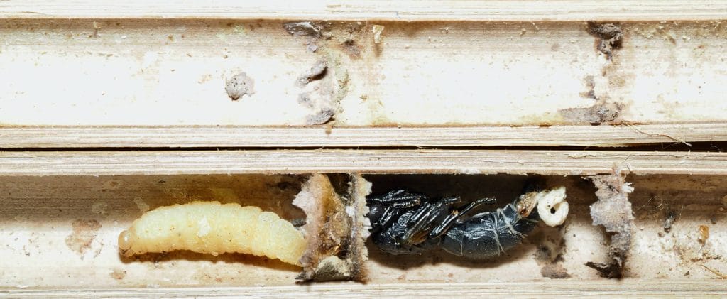 相對於其它蜾蠃都是使用泥土築巢,中華異喙蜾蠃卻選擇了樹脂作為築巢材料,這也是後來吸引我們觀察的主要原因。巢穴入口會用樹脂堆出一個出入口,因此很容易識別哪個是牠的巢。