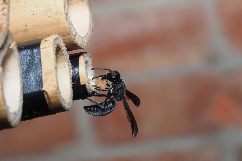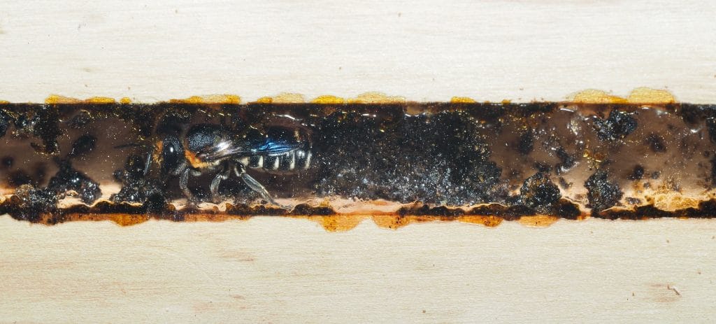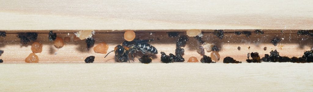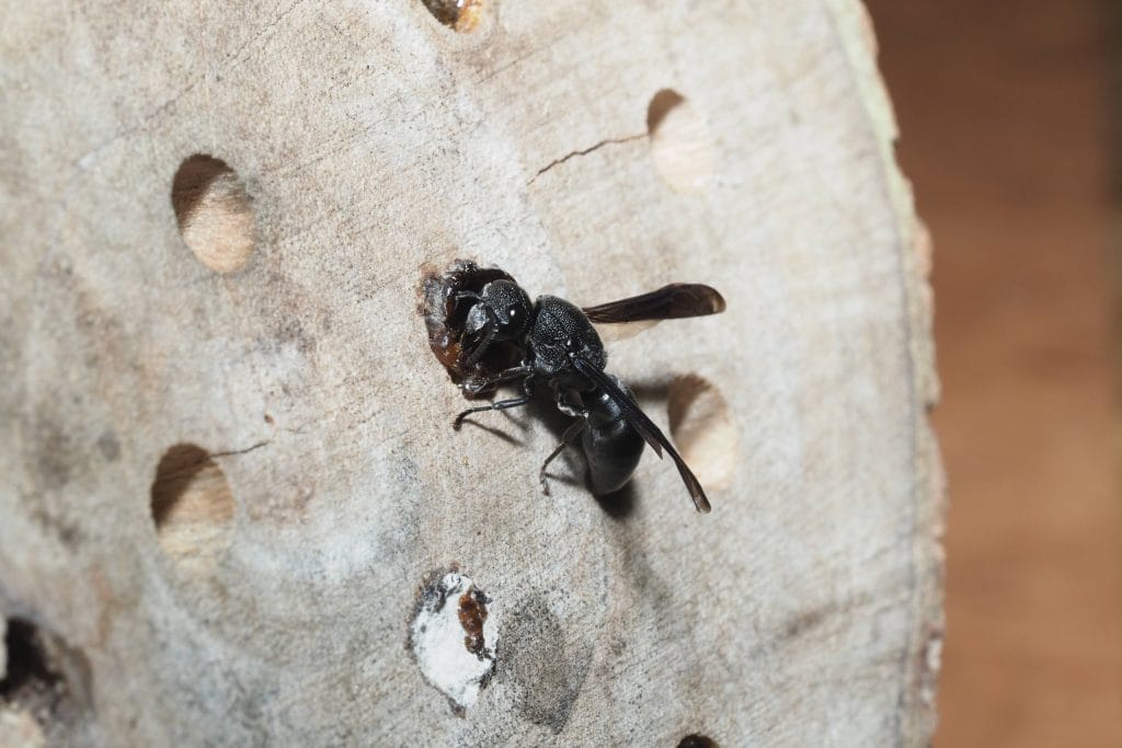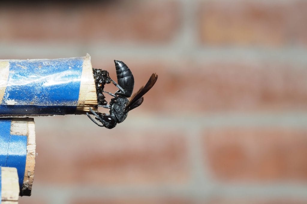 下午條切熄火可能採集花粉去了,換成中華異喙蜾蠃接棒,著實令人驚喜。中華異喙蜾蠃屬於漸進供糧型,築巢的時程非常緩慢漫長,牠們會將黑色樹脂堆積在巢口形成一個小通道,常常會在巢管內守候減少寄生的入侵,屬於非常盡職的媽媽。