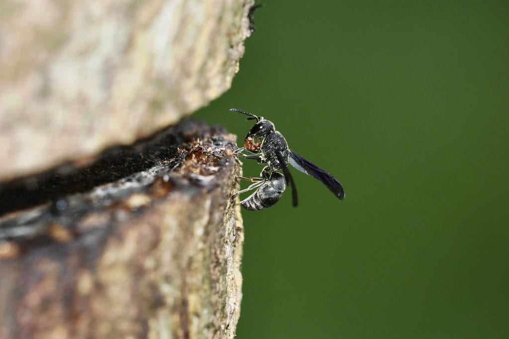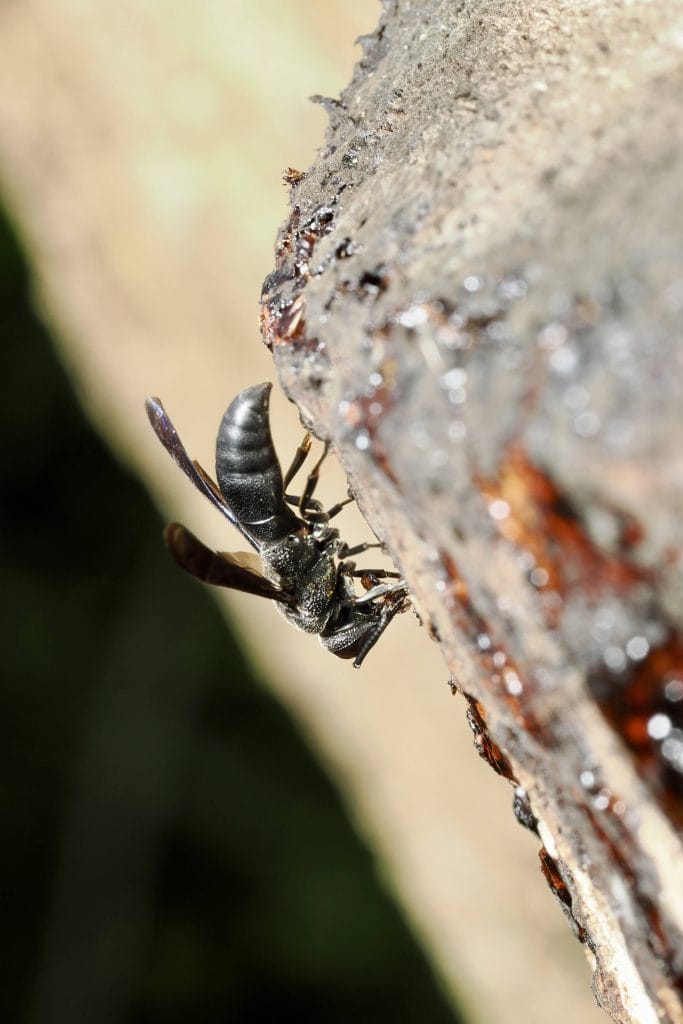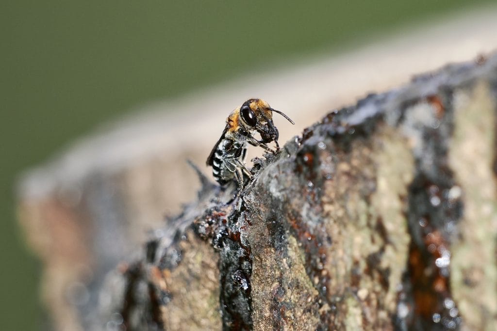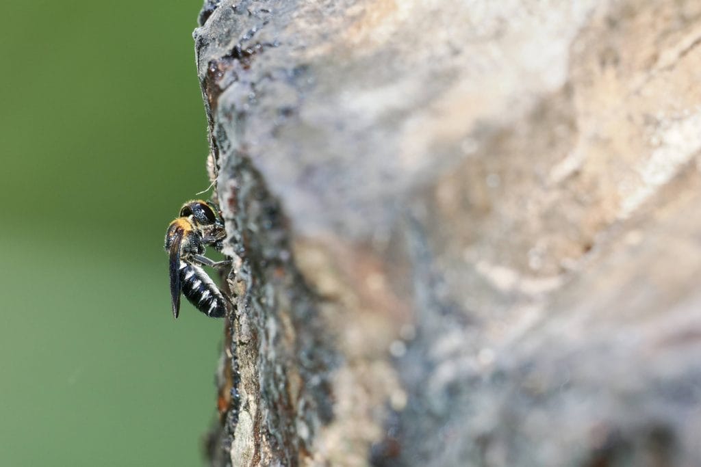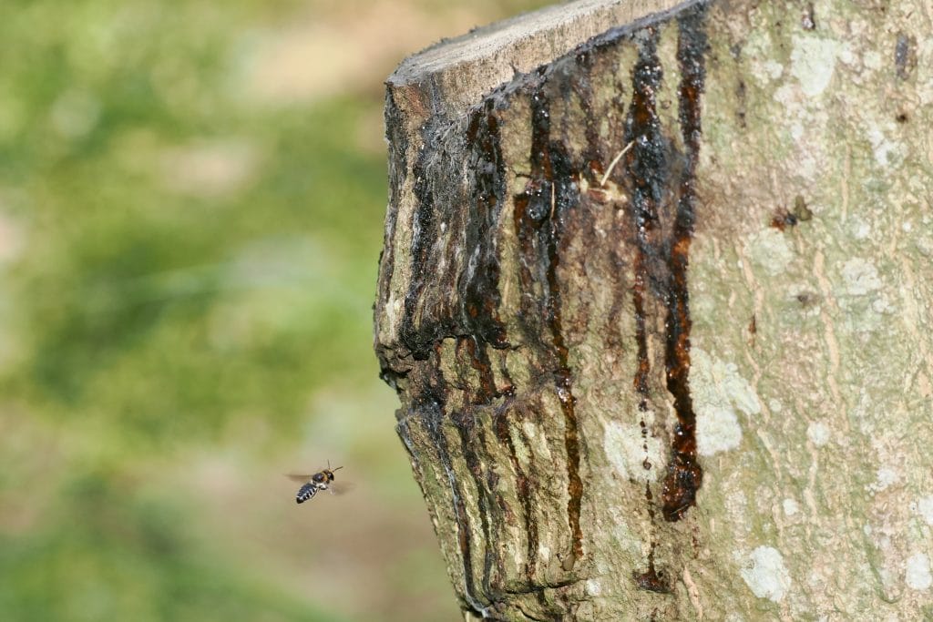 荒野的夥伴秀娥姐在竹東圳路觀察蜻蜓多年,她敏銳的觀察力不但懸掛枝頭的晏蜓無所遁形,還常常對蜂類有獨特的發現,比如説丘切葉蜂切割杜虹的葉片,黑腹虎頭蜂的巢,和最近她po在臉書膜翅目社團的照片,一隻條切葉蜂在樹幹上,看似舔樹液的動作我一看就知道是採集樹脂,立馬問了位置隔天前往觀察,果不其然如我所想。這種切葉蜂野外採脂的行為非常不容易觀察,有時需要很多的運氣才能遇到!所以有機會必須立刻把握。