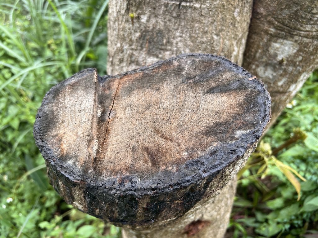 這棵流淌著樹脂的是株被砍掉的芒果樹,大量樹脂由傷口處滲出應該有一段時間了,之前曾經經過這個路段好多次竟然沒有注意?附近是人家的菜園和苦茶園,作物種類非常多元。