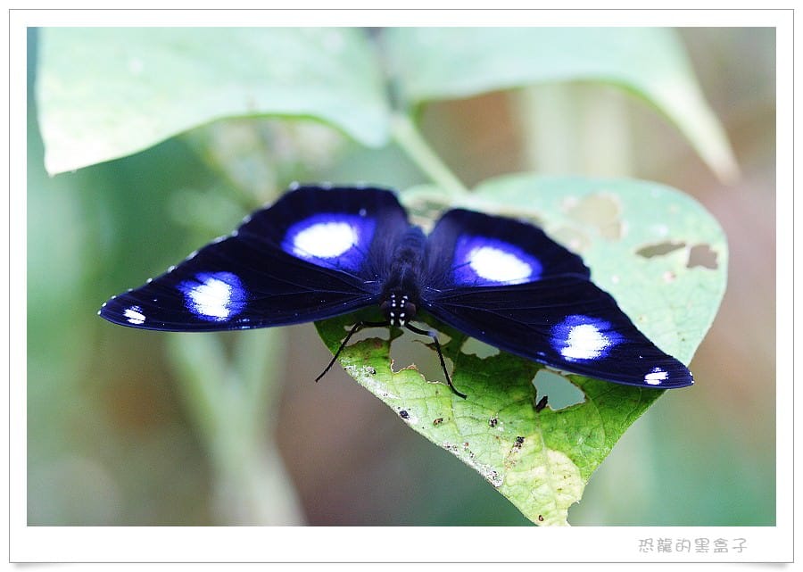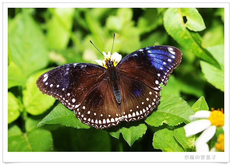 其實雄蝶張翅時背面有4片藍色的大色塊,在某個平視的角度非常明顯,牠們的領域性很強,常常會佔據枝頭驅趕過往的其蝴蝶。
