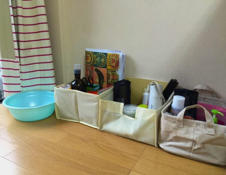生活雜物,包括化妝品、茶飲藥品、學習講義、吹風機、衛生紙⋯⋯,全都裝在地上的三個小布盒裡。