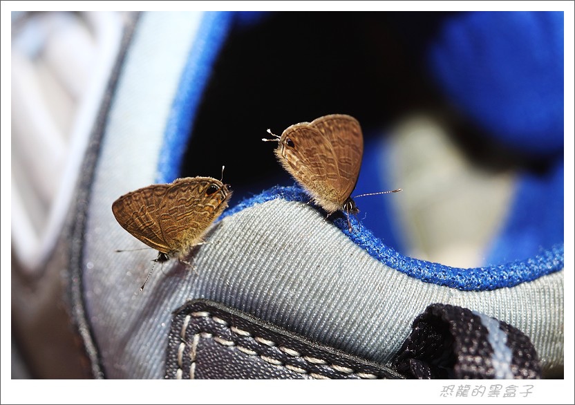 吃中飯的時候,一個小朋友洗手時不小心踏進溪裡,衣服褲子鞋子都濕了,忙著找其他小朋友張羅乾衣服幫他換,沒想到晾在一旁的濕布鞋竟然立刻吸引了2隻姬波紋前來大快朵頤,大自然真是一個理想的教室啊。