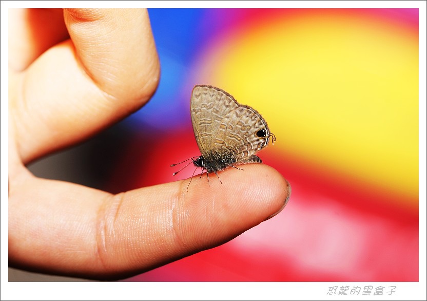 沒多久就有小朋友上手了,看著這些不起眼的小灰蝶停在自己的手指上,連平常活潑好動的小朋友也變的安靜下來,深怕嚇飛了這些小食客。他們也迫不及待地要跟老師們分享這種神奇的能力,「老師,我吸引了3次蝴蝶停在我手耶」。