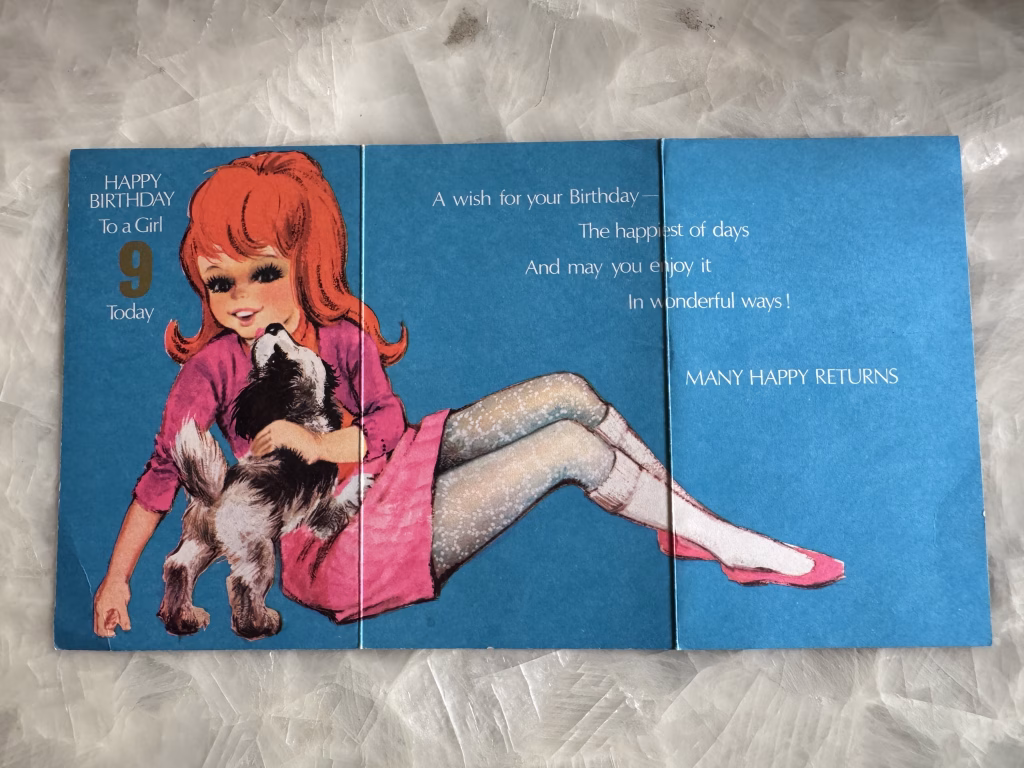 隨郵票簿一起「出土」的是一張生日賀卡和一張老照片。照片中的她模樣稚嫩,穿著母親精心縫製的小洋裝,背著手,短髮側分梳出一條清楚的溝線。她皺著眉、沈著臉,彷彿頭上頂著一片久久不散的烏雲。她定靜站在一棵樹前,無視於腳旁棲著一隻貓的慵懶。