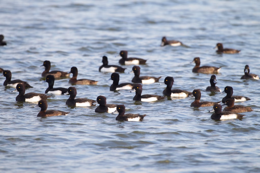 鳳頭潛鴨又名澤鳧,比較喜歡大面積的水域,金城湖中偶而可以見到小群。雌雄相異,雄鳥繁殖羽頭部有一小辮子是為鳳頭,腹部有一塊大白斑明顯易見。