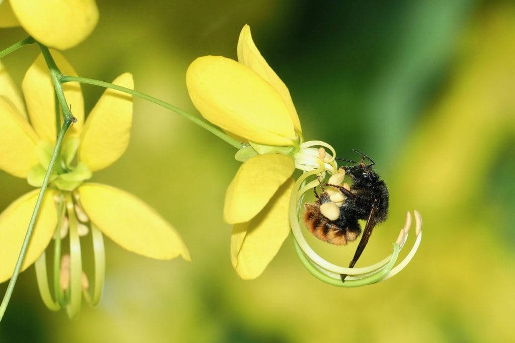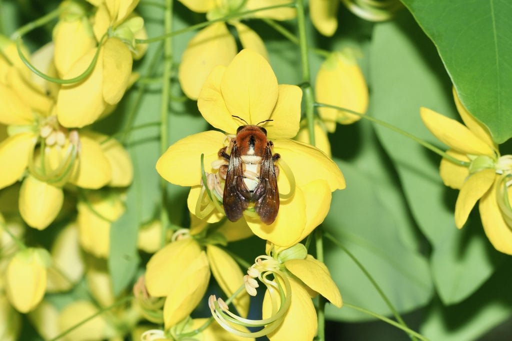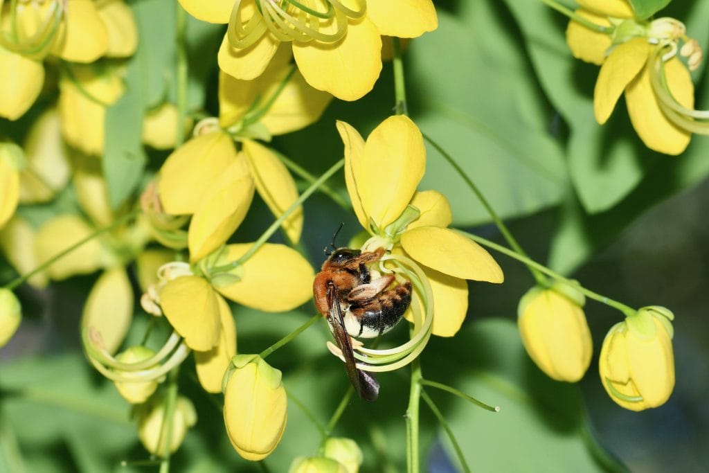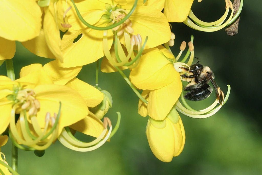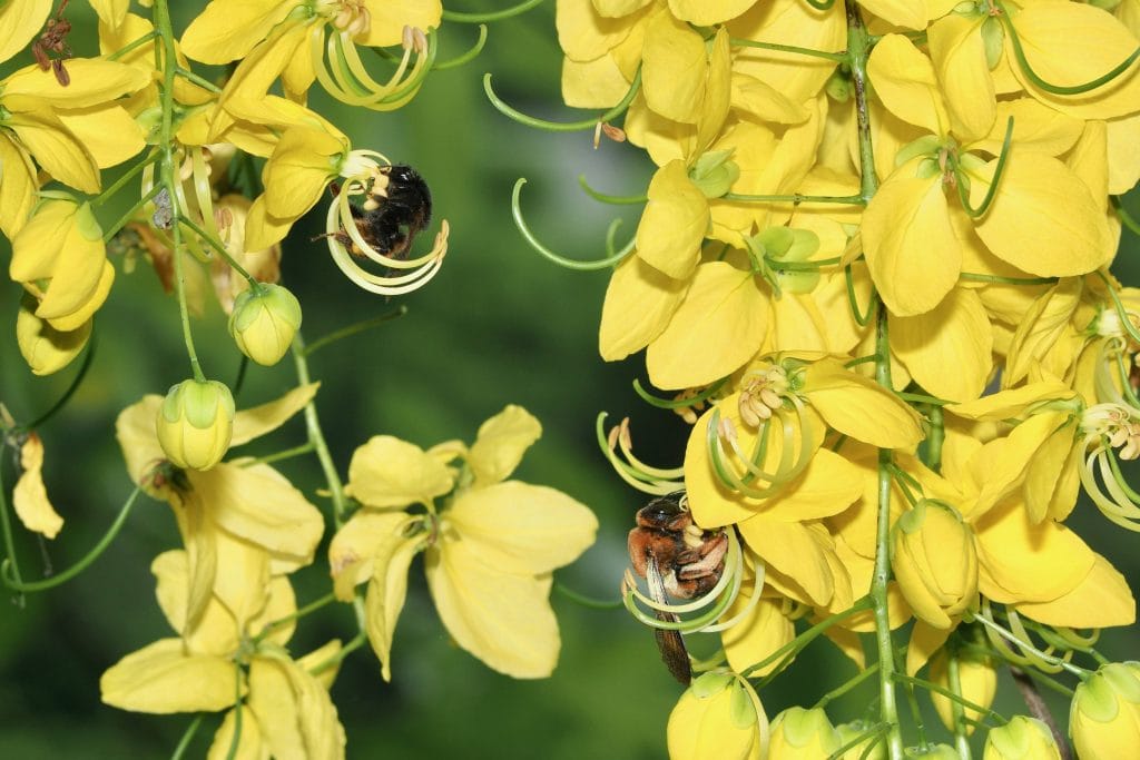 細數阿勃勒的花有10枚雄蕊,3枚較長彎曲成圓弧狀,4枚中等和3枚較短的不孕雄蕊,其中長型雄蕊產生的花粉可孕供授粉用,短型雄蕊產生的花粉不孕供餵食用,所以屬於異型花藥。