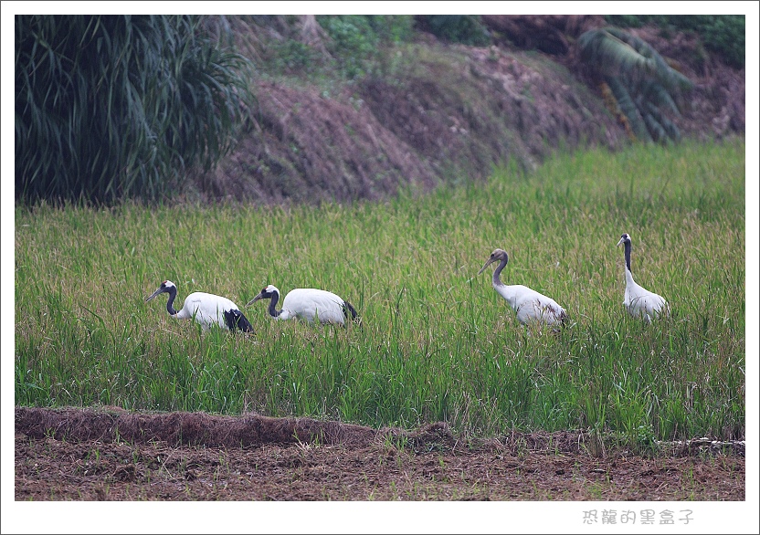 這次則有4隻來到台灣,從頭頂的羽色判斷有3隻成鳥和1隻亞成鳥。休息地不過是溪邊的一小片稻田,溪邊的樹林和壟起的田埂提供了一處避風的地方,遠處的一畝田則有些零星的稻穗,可能是吸引牠們停留的原因。