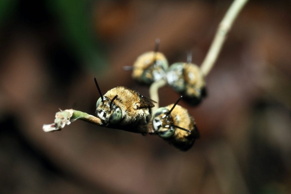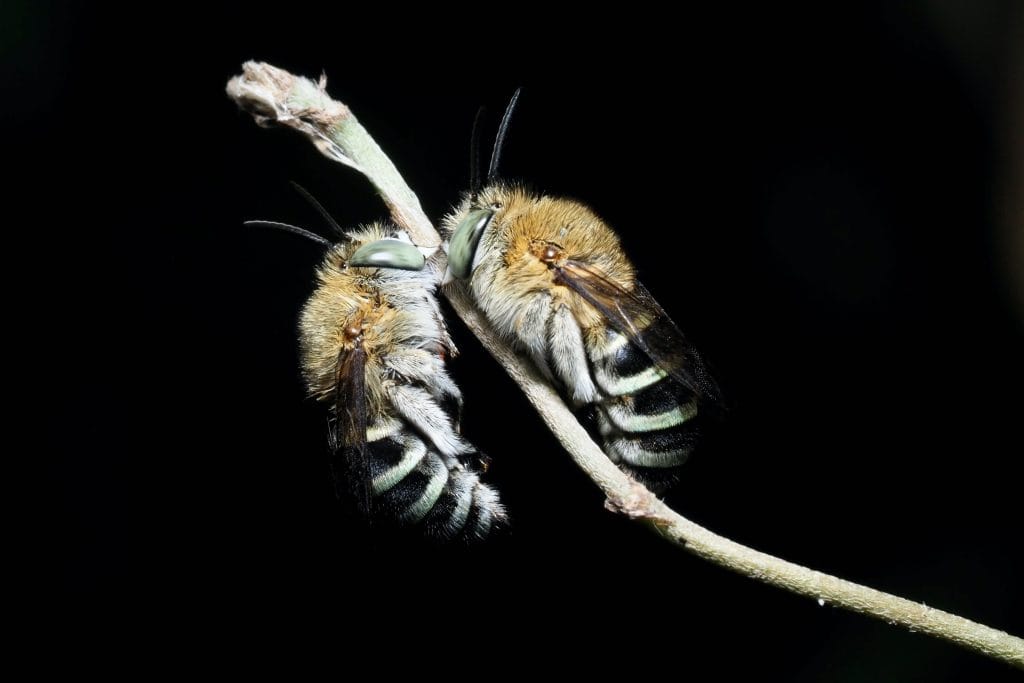這個夜棲點是0325跟小昱一起夜觀時發現的,小孩的眼睛就是銳利,高度也剛好平視角,竟然可以發現四隻青條花蜂在低垂的藤蔓上睡覺。他們以大顎咬住枝條,六腳懸空的模樣甚是可愛。因為夜棲地點是固定的,所以每隔一段時間我就會去記錄一下,看看數量增加的狀態。