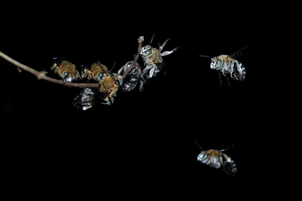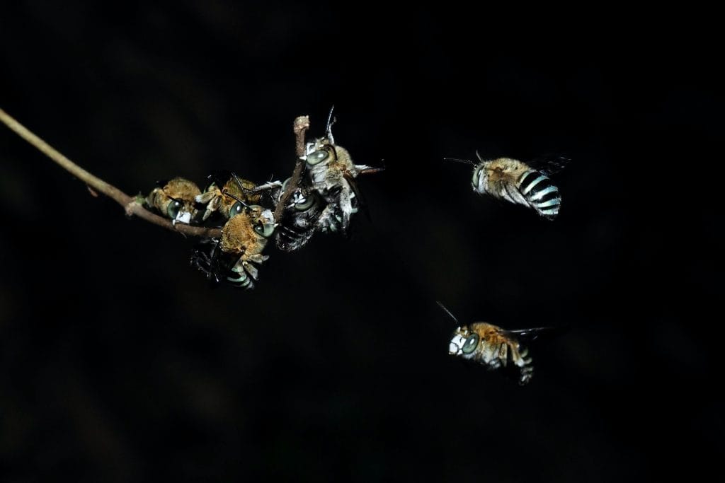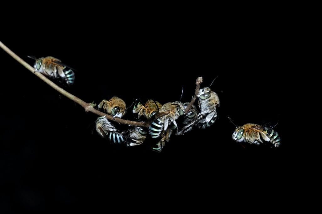 隔天大約傍晚05:56左右下去觀察,夕陽最後一抹餘暉照射在草莖上,蜂群開始聚集準備夜棲。他們圍繞著枝條飛舞,然後接二連三降落,遇到干擾會暫時飛離,此時還未全黑,容易躁動。他們會從末端沒有葉片的枝條開始停棲,緊密地靠在一起,然後漸次往後尋找空位降落。降落後以大顎咬住枝條,有時還會用腳清潔身體。