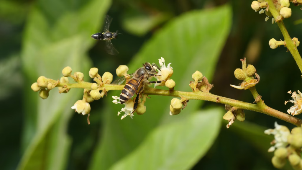 這是龍眼林中最熱鬧的族群。除了人類飼養的蜜蜂,還有許多「野生高手」。西方蜜蜂與東方蜜蜂是龍眼蜜產出的主力。牠們對龍眼花具有高度的忠誠度,會反覆採集同一區域的花朵。