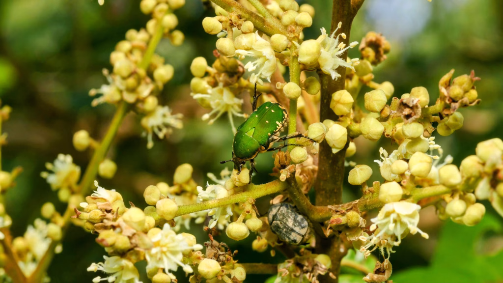 甲蟲類在龍眼花上的行為通常比較「暴力」,牠們在採蜜的同時往往也會啃食花藥或花瓣。其中花金龜數量最多,這些甲蟲會在花叢中鑽動,身上沾滿花粉,無意中完成了異花授粉。