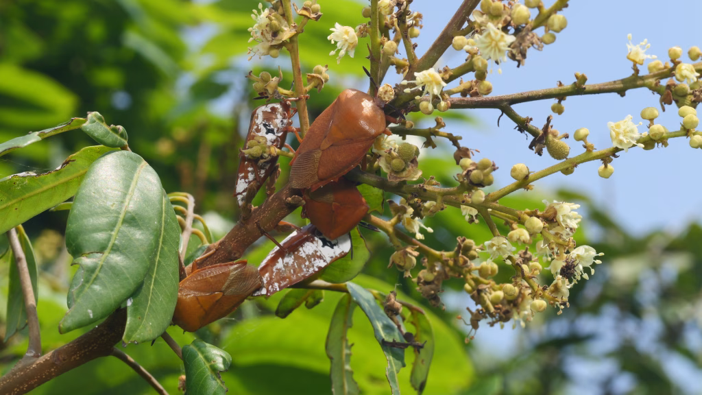 這類昆蟲在龍眼花序上非常活躍,有些甚至與龍眼產業的病蟲害管理息息相關。其中荔枝椿象 (Lychee Giant Stink Bug)若蟲與成蟲常在花穗上吸食汁液,雖然牠們不採蜜,卻是花期最顯眼的半翅目成員。