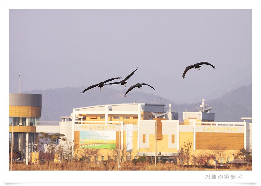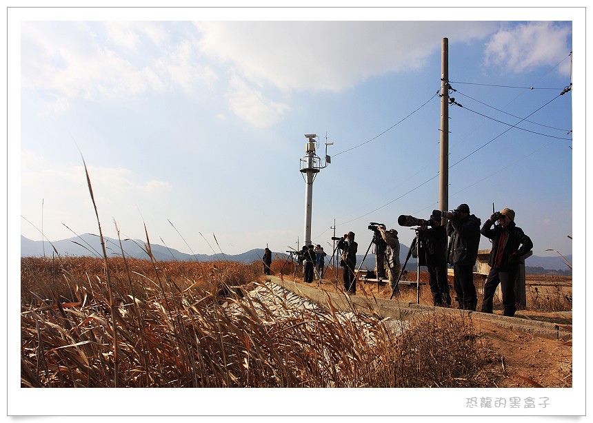 由於事先沒有做功課,所以剛到時對這裡的鳥況並不清楚,不過鳥導鶴先生說這兒是韓國白頭鶴度冬的最大棲地,最多時有290隻之多,除此之外還有一些雁鴨、琵鷺等158種候鳥在此度冬。整個園區的海岸線長達39.8公里,全部灘塗面積約21.6平方公里,乾躁期露出的面積則有12平方公里寬,算是很大的園區而且禁行機動車輛,這下大家都傻眼,步道總長據說有8公里,扛著重裝走到那裡恐怕大家都掛點。