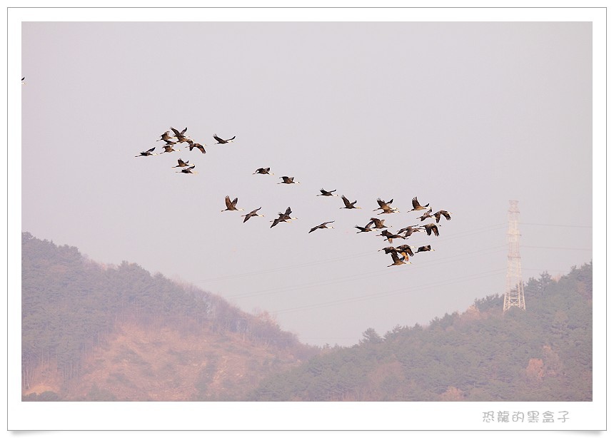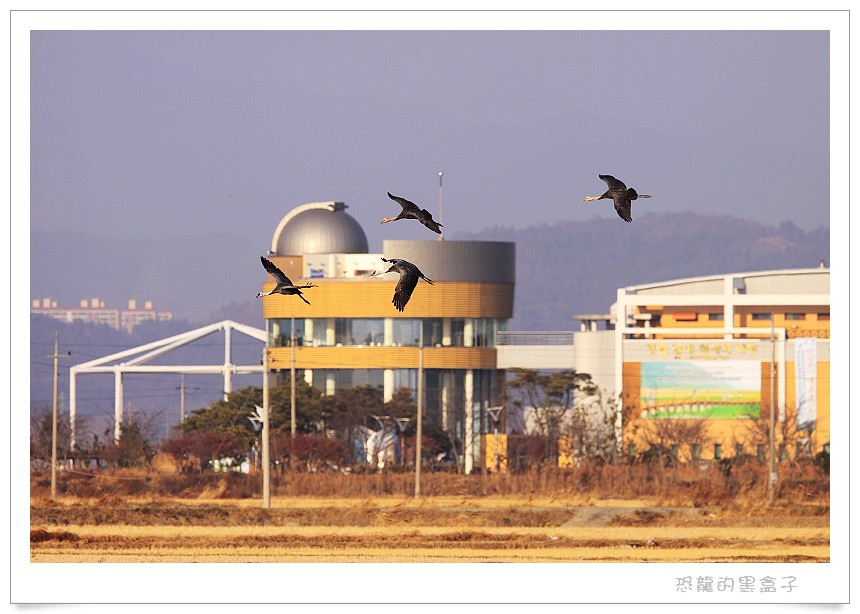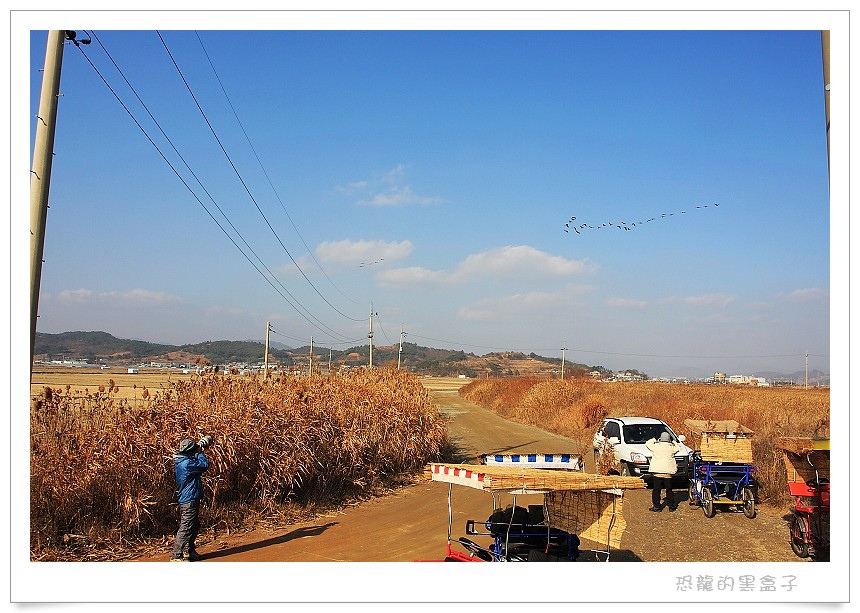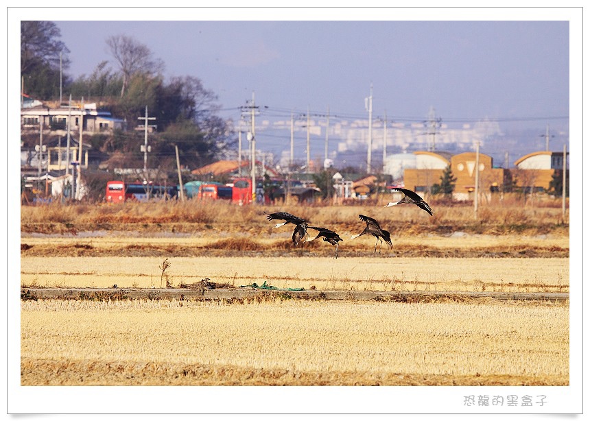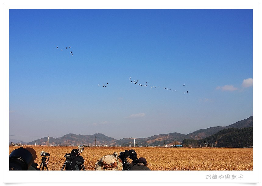 不過也許就是晚了這20多分鐘,讓我們在一進入順天灣的園區時,就看到這群白頭鶴從田間飛起迎接我們,而且其中還夾雜著 一隻稀有的「西伯利亞白鶴」,據後來園區的生態管理人告訴我們,這可是順天灣第一筆白鶴的紀錄唷,果然來的早不如來巧呀。