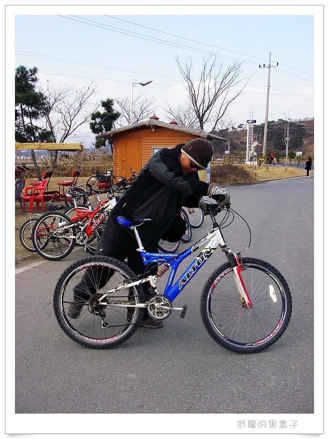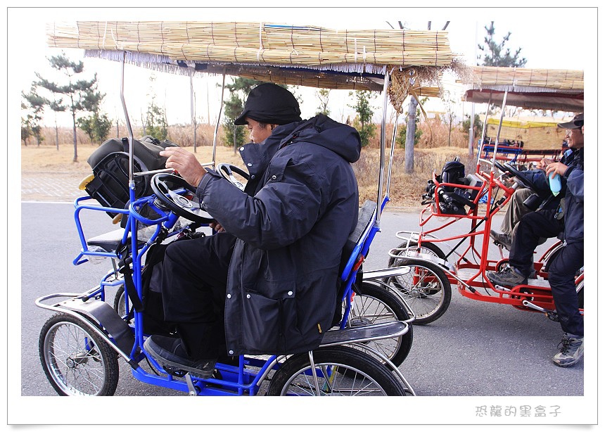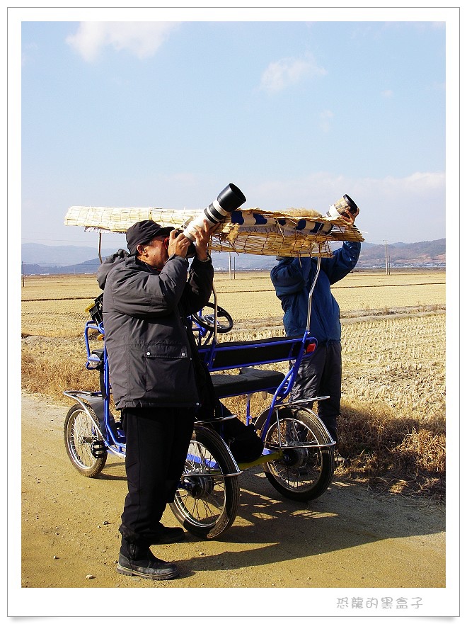 這倒不失為一種很好的賞鳥方式,即少了廢氣與噪音的污染,又多了一份自主悠遊的樂趣,不過老婆大人琵琶別抱跑到別車幫忙踩,我只好孤軍奮鬥了。韓國的鳥導鶴先生已經72歲了,是研究鶴類的專家,本姓「朴」不過我們都尊稱他為「鶴」先生,他騎著鐵馬先行為我們探去了。